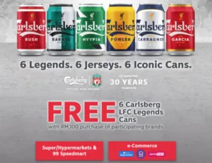 You can visit your neighbourhood super/hypermarkets or even a 99 Speedmart and make a purchase of RM300 worth of participating brands in a single receipt to receive all 6 of the Carlsberg LFC Legends Cans for FREE! Be quick as these limited edition cans are only available from August 1 through September 11. The same rules also apply to online shopping sites like Shopee Supermarket, Potboy, and pandamart!