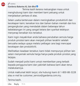 Taking into their official Facebook page, Gardenia Bakeries (KL) Sdn Bhd has stated that the latest price increase is due to the impact of inflation on raw materials, such as flour and vegetable fat. On the other hand, the company has also mentioned that the rising cost of logistics over the years has been the biggest factor for them to raise the price.