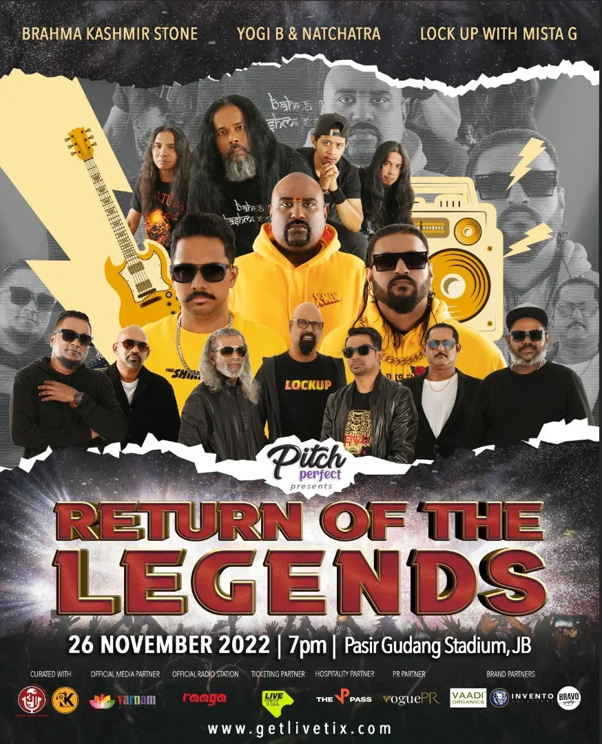 A truly Malaysian Indian concert is set to rock Johor Bahru this November featuring 3 legendary Malaysian performers on the same stage for the first time. “Return of the Legends’ will mark the return to the big stage for YOGI B & NATCHATRA, BRAHMA KASHMIR STONE, and LOCK UP WITH MISTA G.