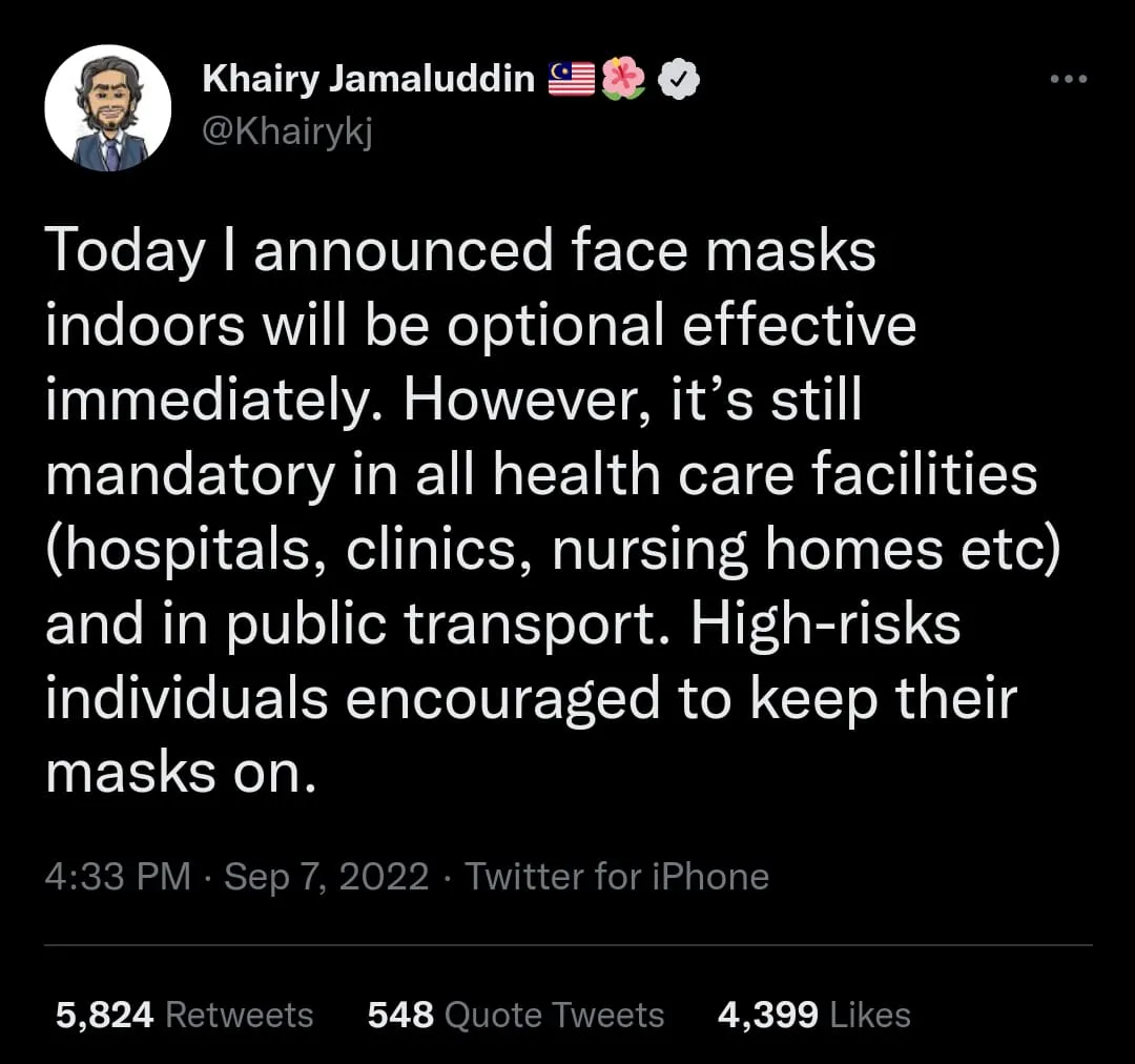 Health Minister Khairy Jamaluddin announced at a press conference yesterday (7th September) that the usage of face masks in enclosed settings is now optional in light of the current Covid-19 situation in Malaysia.
