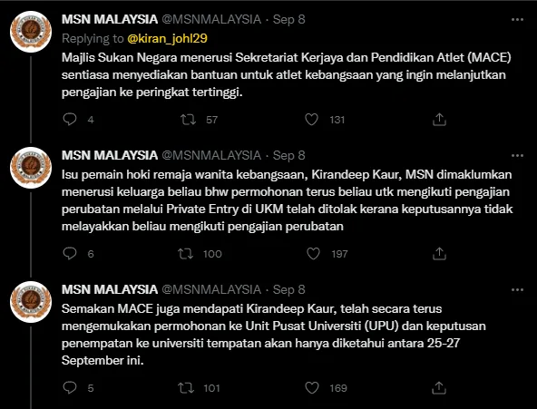 “NSC through the Malaysian Athlete Career and Education (MACE) always provides assistance for national athletes who wish to further their studies to the highest level,” NSC responded in Kirandeep’s tweet thread.