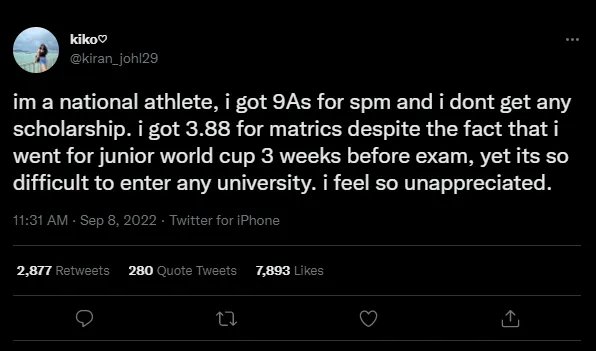 Kirandeep claimed that despite being a national athlete and scoring 9As in her SPM, she could not secure a scholarship. She went on to say that her tweet was in reference to private university applications.