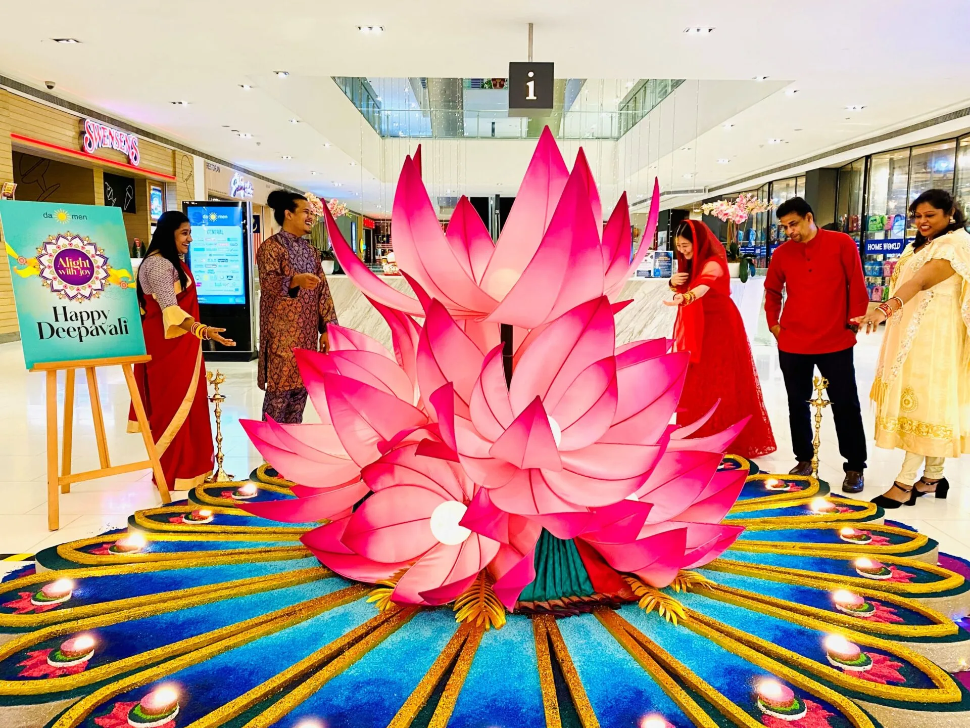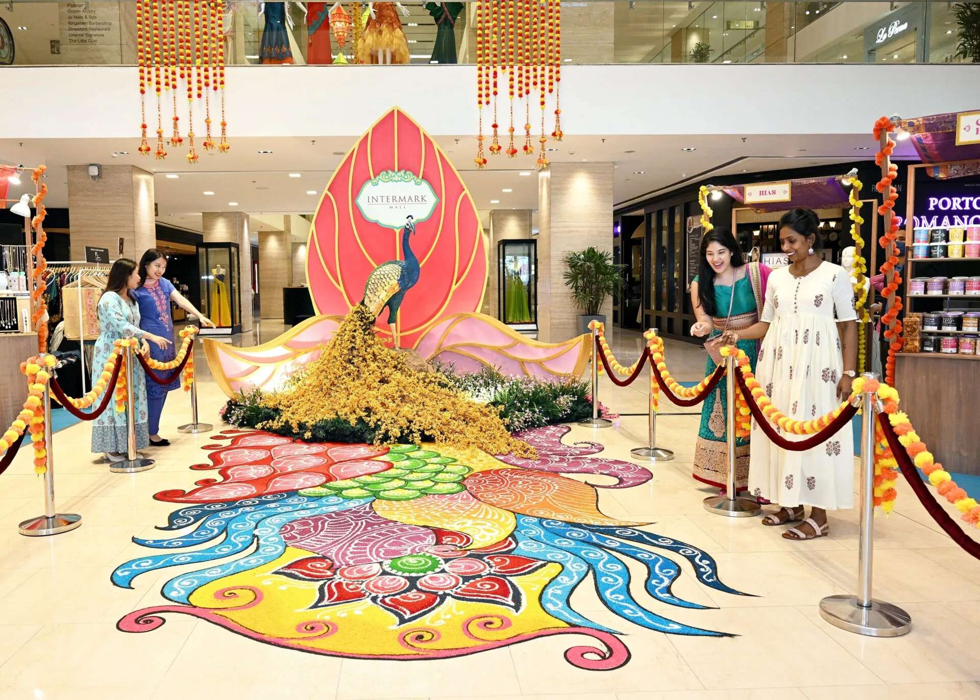 Be sure to stop by and admire the glorious decorative elephants and colourful kolams illuminating the iconic Crystal Fountain. In Hindu culture, elephants are sacred symbols of peace, mental strength, and power, while kolams signify auspiciousness and good luck. Inspired by stunning saree designs, the mall is decorated with brightly coloured flowers, capturing the hues of the rainbow,— six yards of pure grace, elegance, and beauty commemorating the festive season.