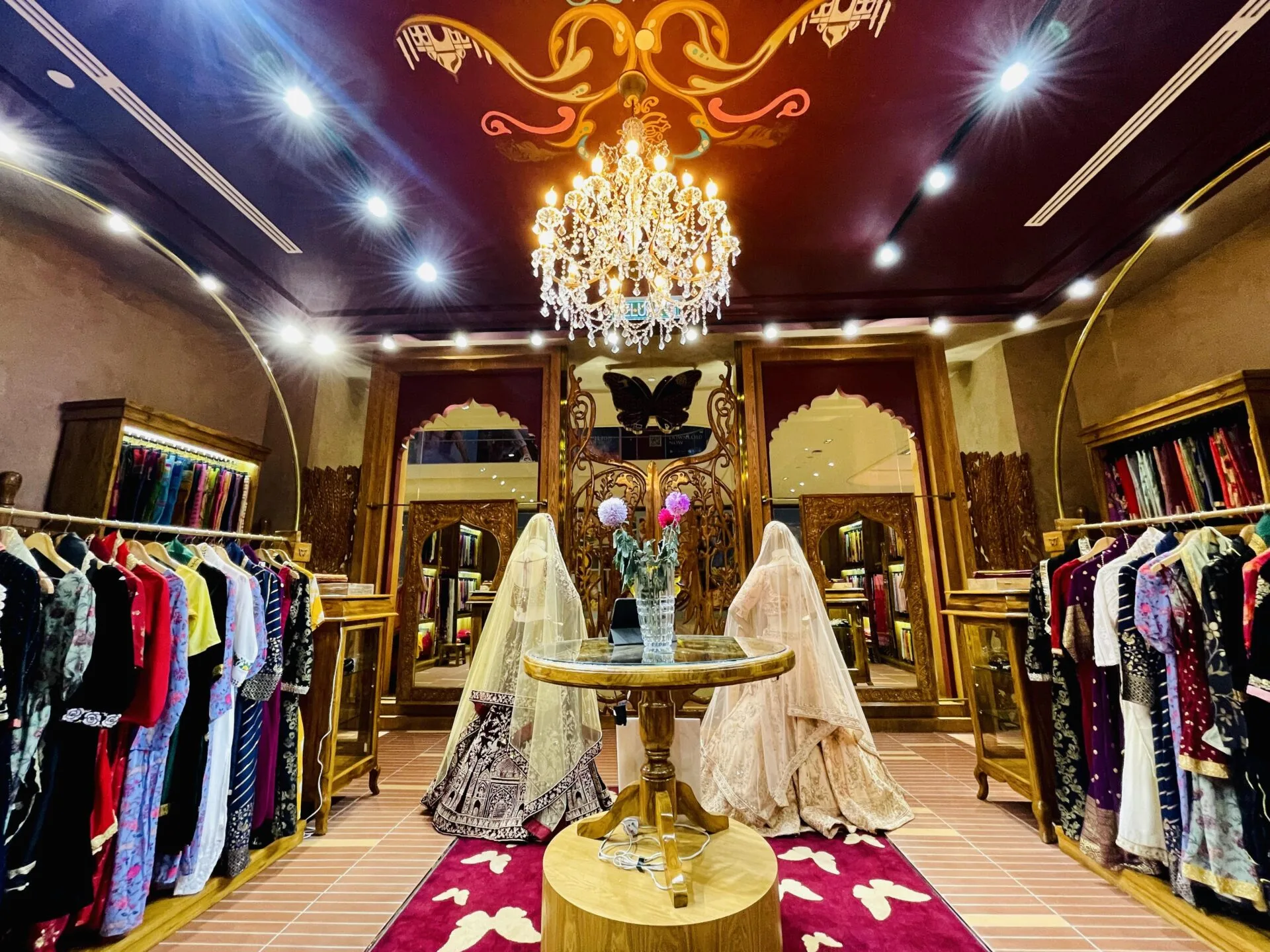 Magnificent teak double doors draw visitors into the main space beautifully furnished with terracotta tiles, Persian silk carpets, Mughal lamps, 8ft tall peacock carved panels and an antique golden handcrafted peacock settee. Paying homage to diverse heritage, the handpainted ceiling is an evocative depiction of classic Indian icons such as the Taj Mahal and the Bengal tiger. Taking centre stage among the opulence are dazzling crystal chandeliers and an intricate hand-painting of a bridal lehenga.