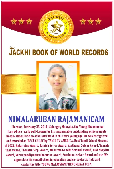 For his noteworthy performance, he was recognized and awarded the ‘Best Child’ by Tamil TV America, Best Tamil School Student of 2022, Kalairatna Award, Tamizh Selvar Award, Saathanai Selvar Award, Tamizh Thai Award, Thesatin Sirpi Award, Mahatma Gandhi Semmal Award, Kavi Nyayiru Award, Veera Pandiya Kattabomman Award and more.