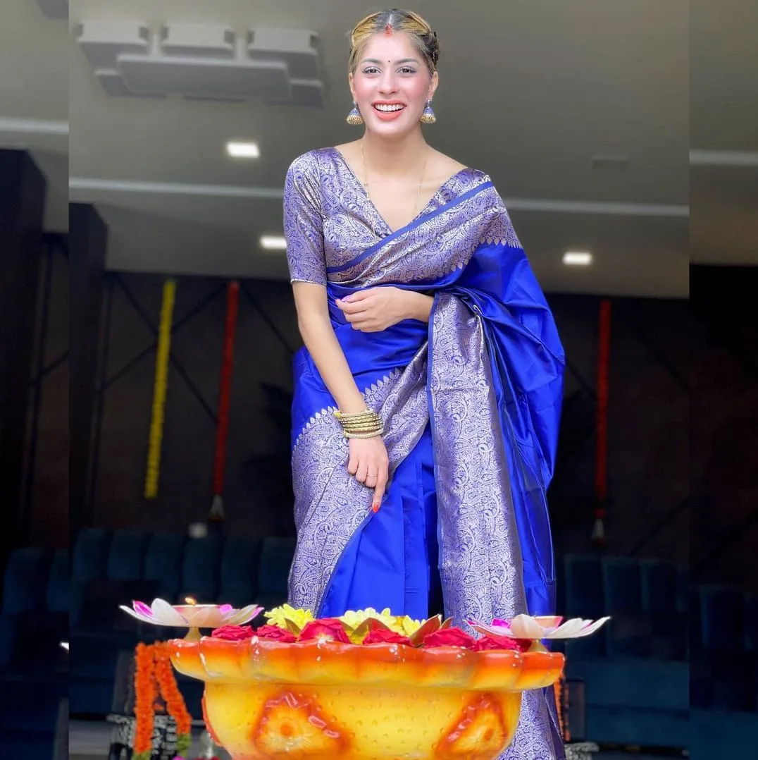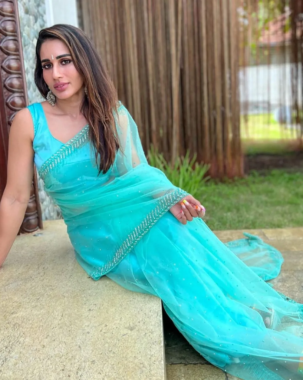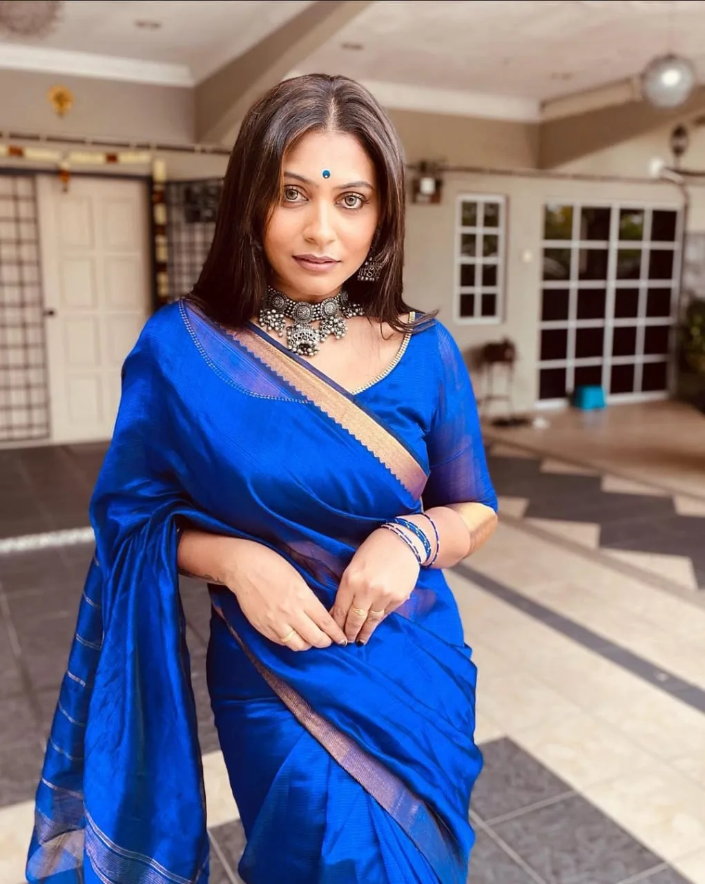 - Nithyaa RV – Another blue beauty, Nithyaa looks elegant wearing a double-toned blue saree.