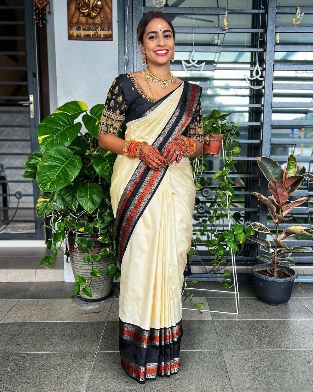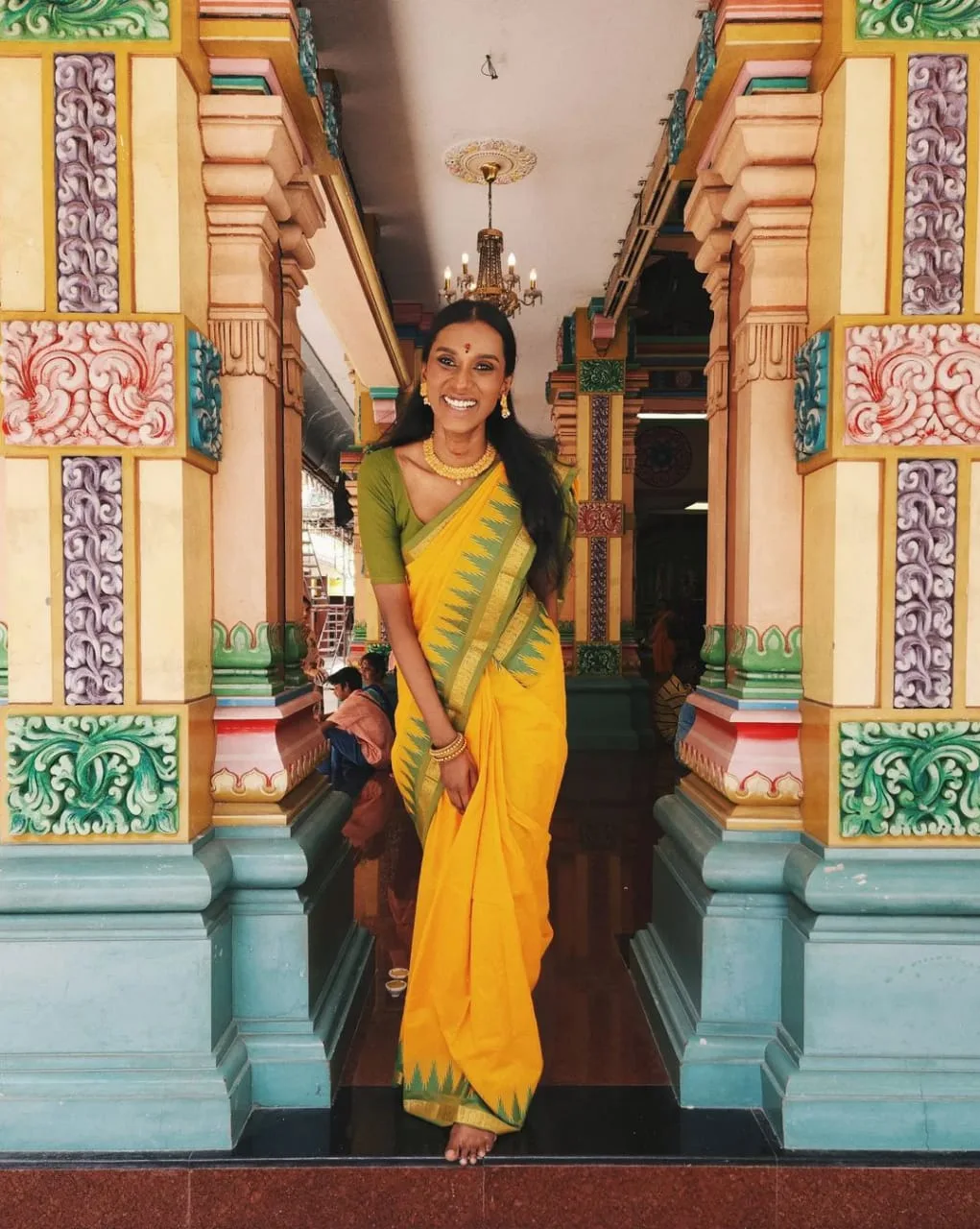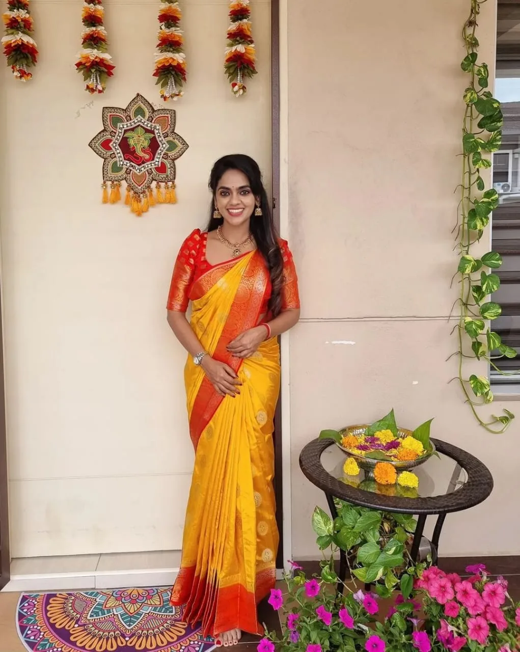 - Revathy Mariappan – Orange-Yellow combination never goes wrong, Revathy’s homely look is breathtaking.