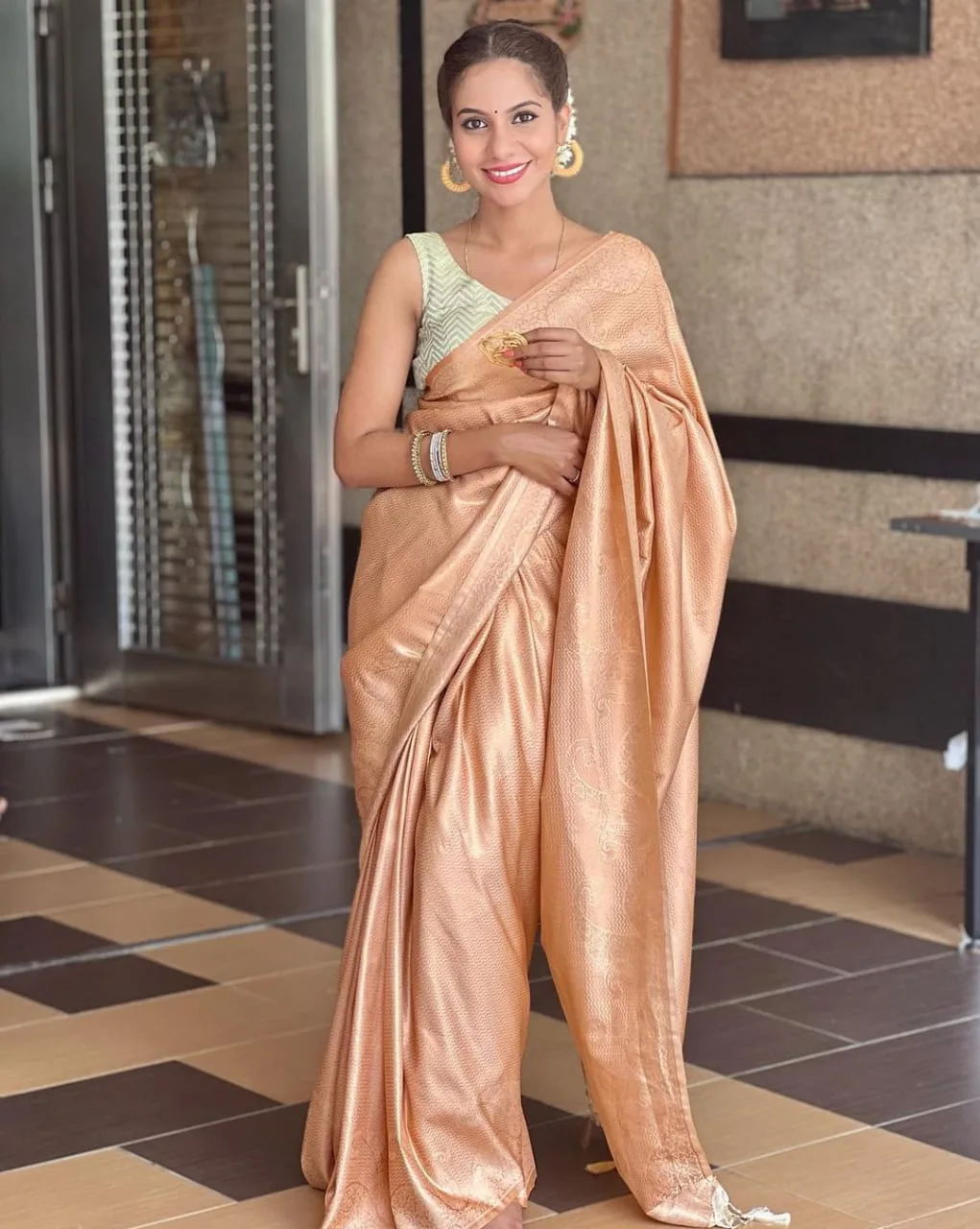 - Kavitha Sinhya – The rising actress looks absolutely gorgeous wearing a glimmery-peachy saree with a matching blouse.