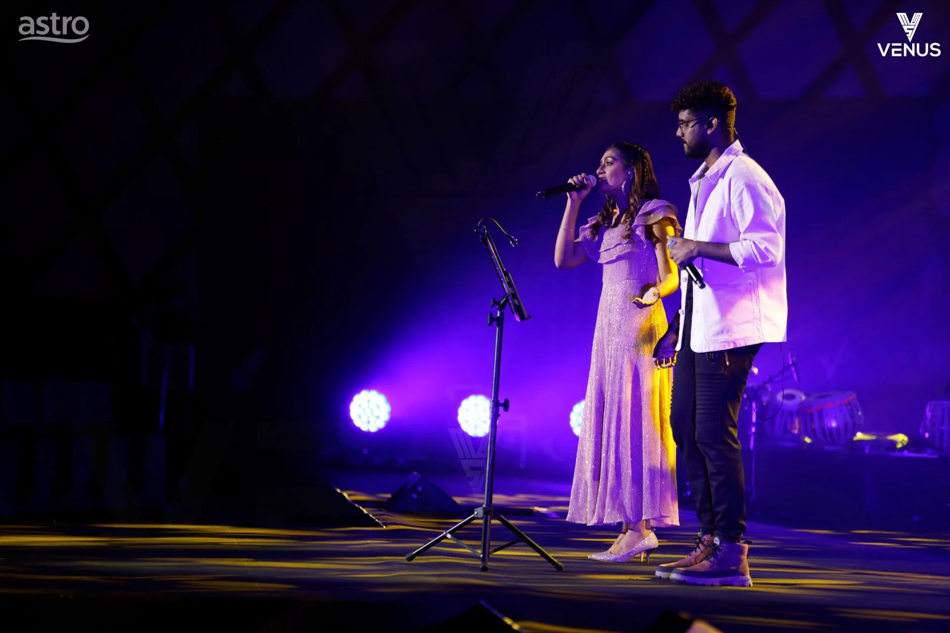 Our very talented local artists, Hashmitha Selvam and Kumaresh Kamalakannan fueled the concert with an opening act dueting two beautiful songs, Naan Pizhai from Kaathuvaakula Rendu Kaadhal and Ennai Konjam from Kaakha Kaakha. The host later brought in and introduced the band that will be performing live alongside the legendary singer. As it was almost time for the legend’s entry, just like pixies adding magic dust to the night, Anantha introduced both Super Singers Haripriya and Srinisha Jayaseelan to the stage.