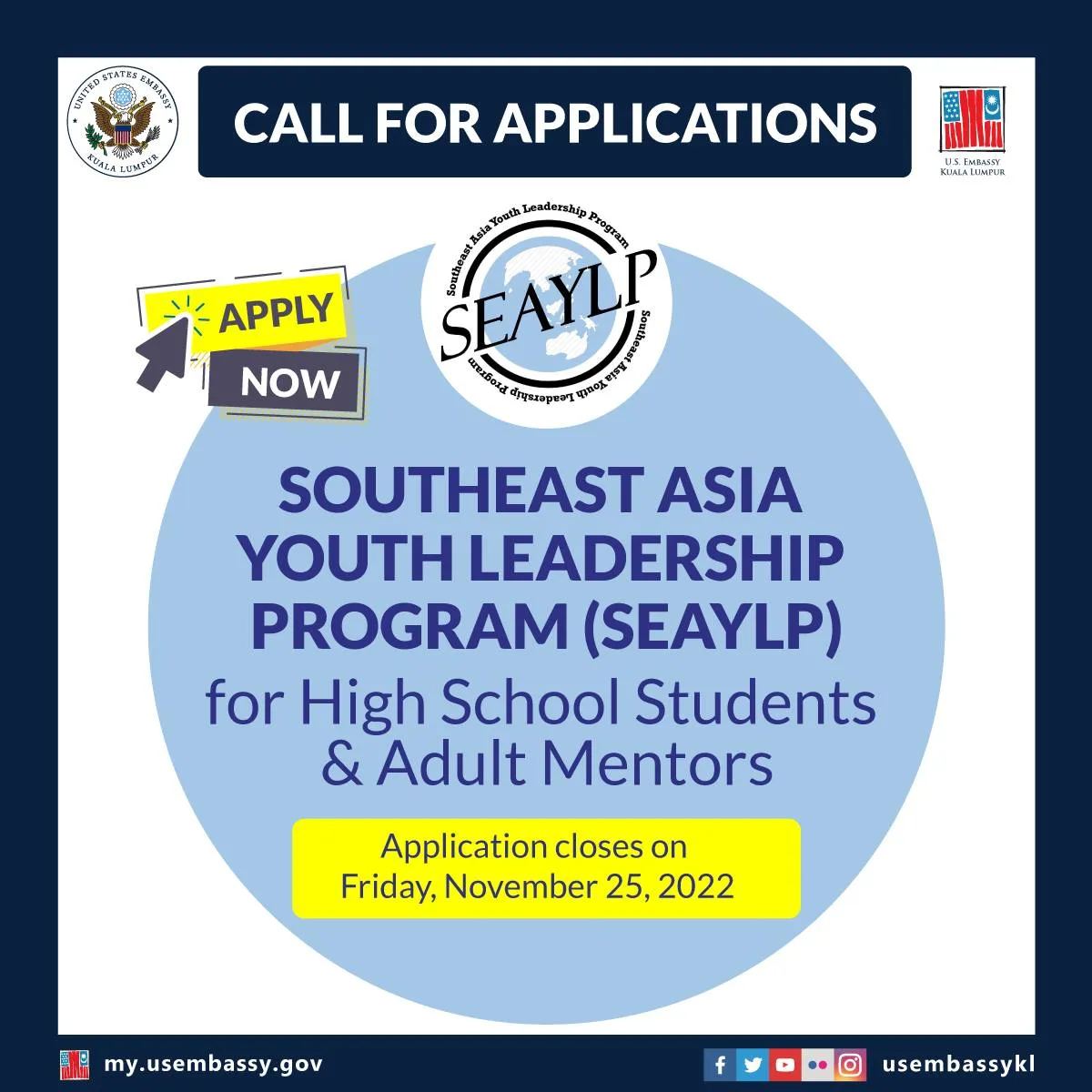 The Public Diplomacy Section of the U.S. Embassy is pleased to announce that the 2023 Southeast Asia Youth Leadership Program (SEAYLP) is now open for application entry. This will be a three-week US-based exchange program that is scheduled to be held from 7th to 28th April 2023 at Dekalb, Illinois.