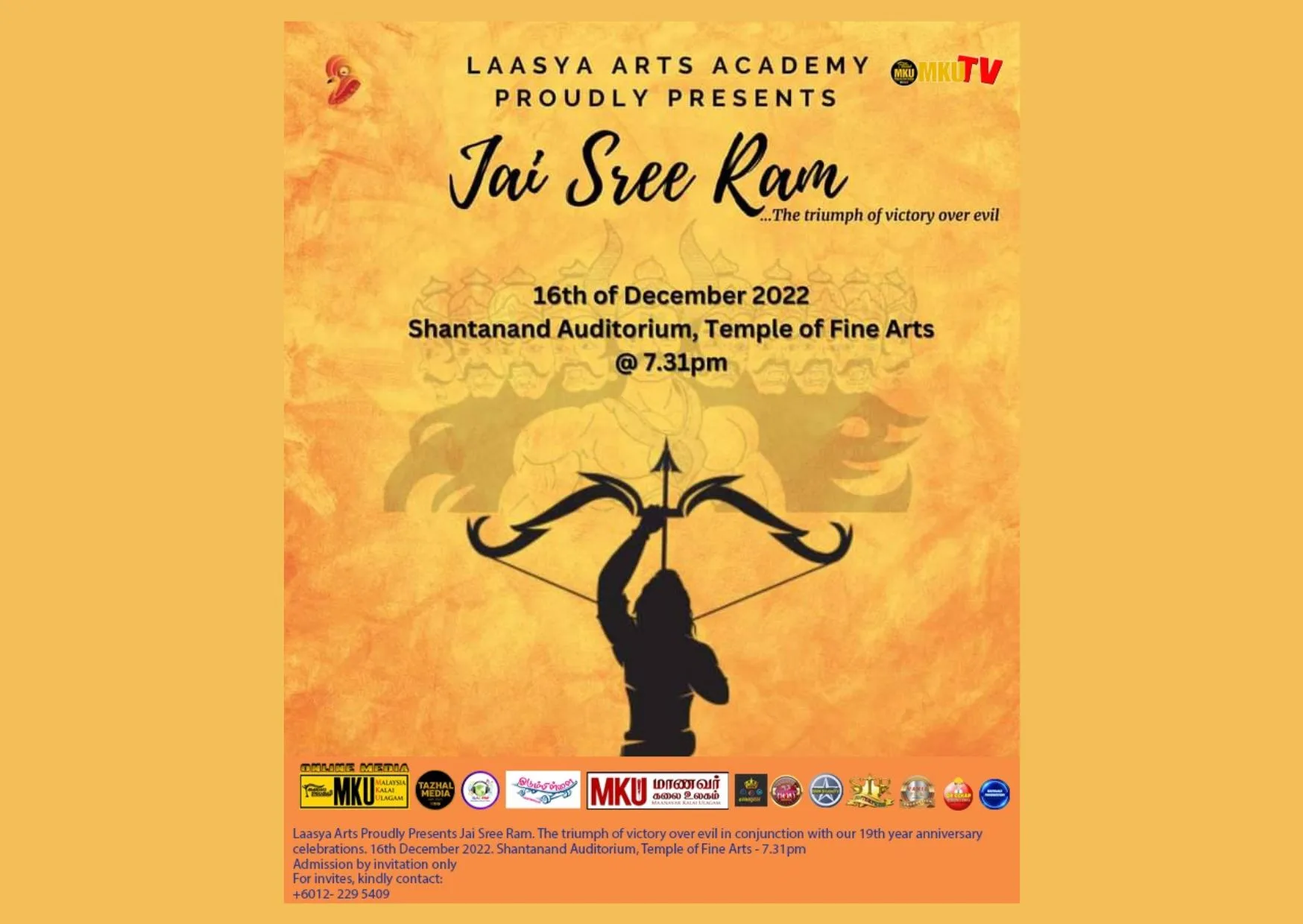 This successful academy is now 19 years and in conjunction with the academy’s 19th anniversary, a special musical theatre entitled Jai Sree Ram -The Triumph of Victory over Evil will be held. This programme will take place on 16 December 2022 at the Shantanand Auditorium, Temple Of Fine Arts, Brickfields. Also, this musical theater is set to be scheduled at 7.31 PM.
