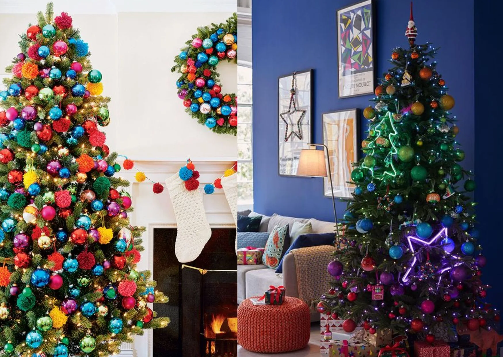 A rainbow of joyful colours can perfectly capture the spirit of a joyous Christmas. Embrace this brilliant trend with a colourful Christmas tree designed for maximalists, or decorate your tree with a variety of your favourite ornaments and colouful Christmas lights.