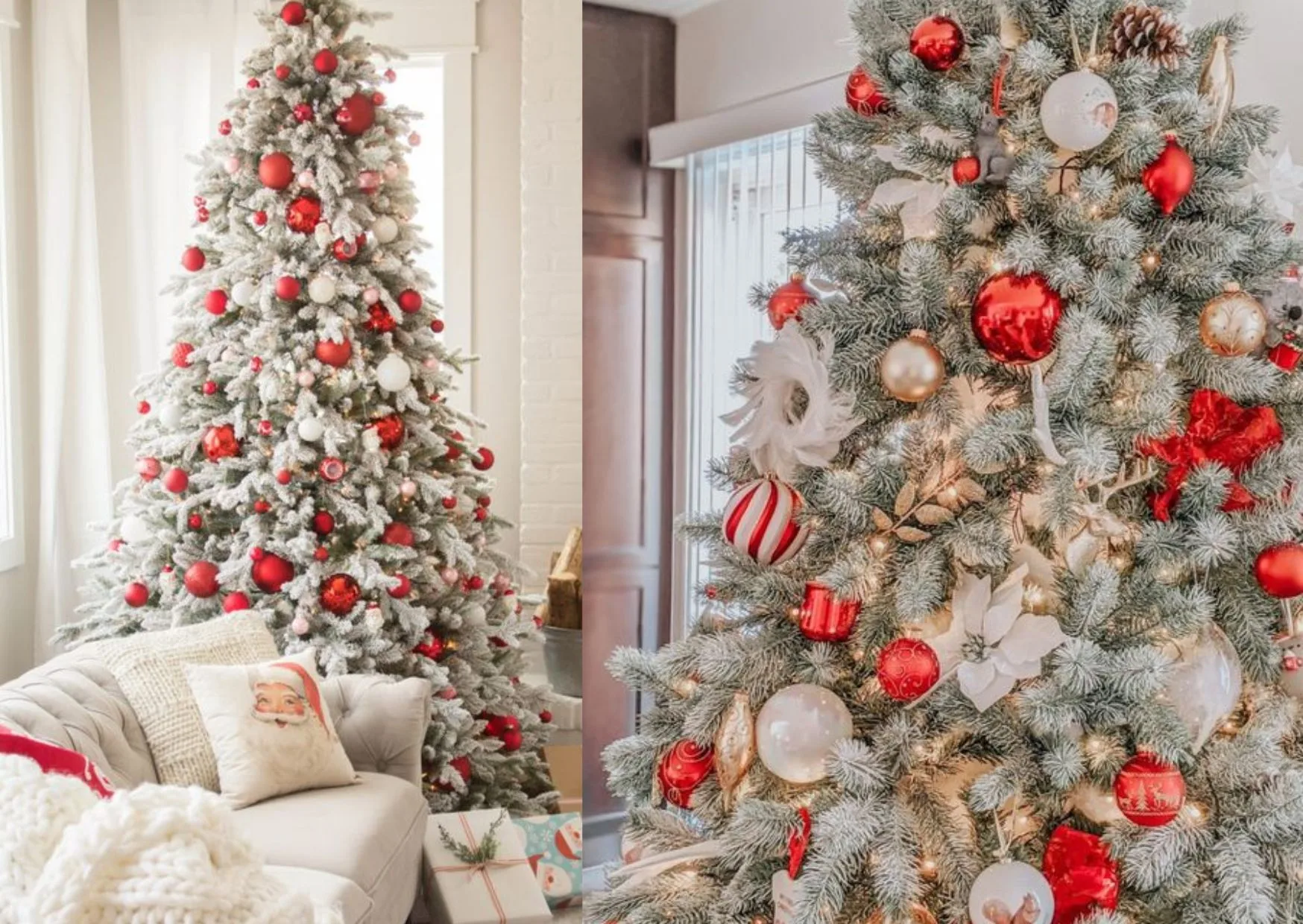 Red and white is a classic Christmas combo that has a mix of a minimal and vintage look. This coordination reminds us of the Christmas candy cane, doesn’t it? This year, white Christmas trees are trendy and make the perfect canvas for red ornaments.