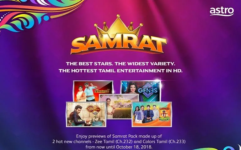 Update (05/03/19): A representative from Astro has confirmed with us that Zee Tamil HD (CH232) was removed from the Astro platform by their channel partner, Zee TV effective 1st March 2019. Samrat Pack customers were informed of the cessation via on-air messages, email and SMS updates.