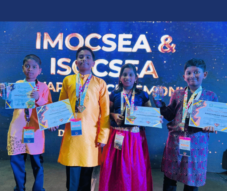 From left, Sasvathram Ramish bagged the Silver Award (SILVER – Top Scorer), Santaasree Kumaraveel received the Bronze Award, Ramcharan Vishnu clinched the Bronze Award (Bronze – 2nd Runner up) and Santhosh Varman Thirumaran bestowed with the Bronze Award.