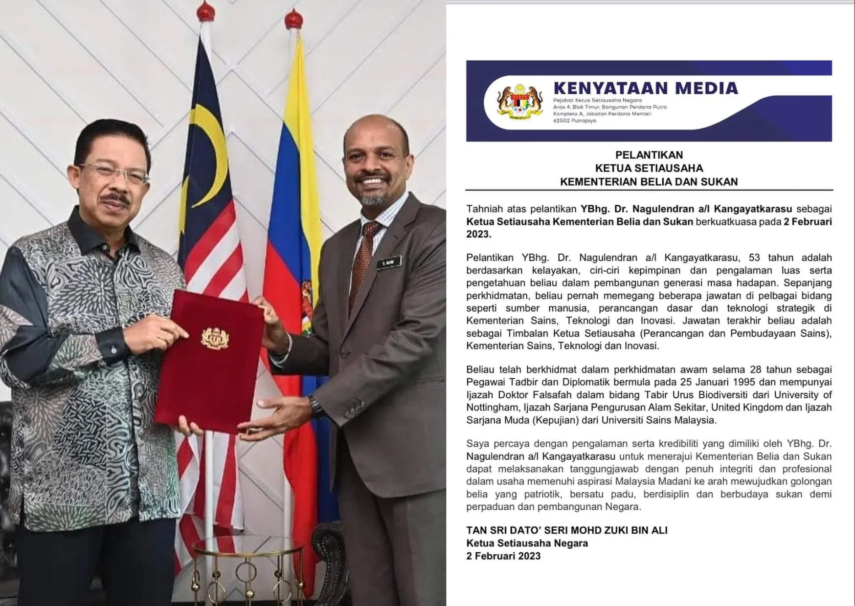 On 2nd February 2023, YBRS Dr Nagulendran Kangayatkarasu has been announced as the new Youth and Sports Ministry Secretary General by Tan Sri Dato’ Seri Mohd Zuki Ali, the Chief Government Secretary.