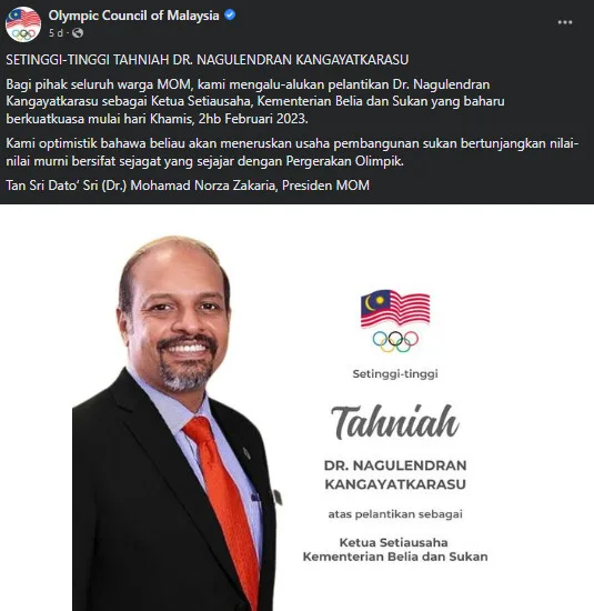Sharing the happiness, Olympic Council of Malaysia also congratulates Dr Nagulendran Kangayatkarasu.