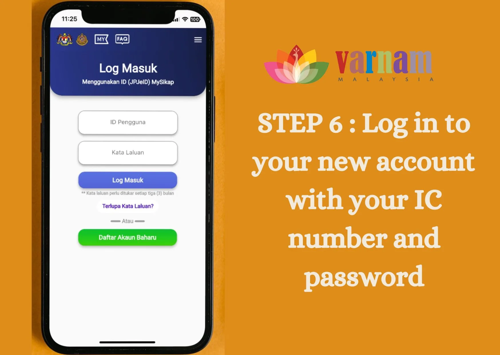 Log in to your new account with your IC number and password