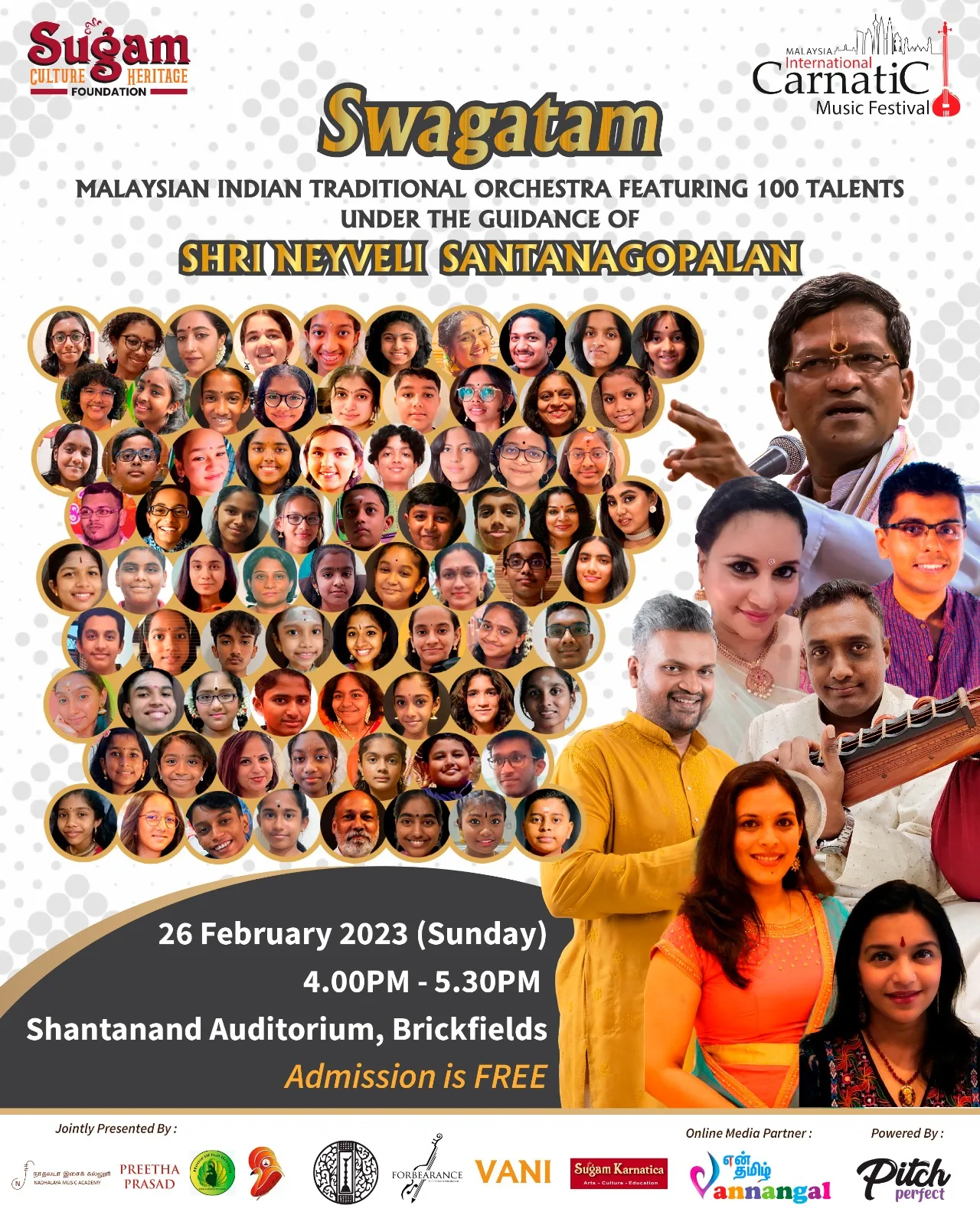 Sugam Culture & Heritage Foundation is organizing Swagatam, a Malaysian Indian Traditional Orchestra with 100 participants from Malaysia under the guidance of Carnatic legend, Sangita Kalanidhi Vidhwan Shri Neyveli Santanagopalan.