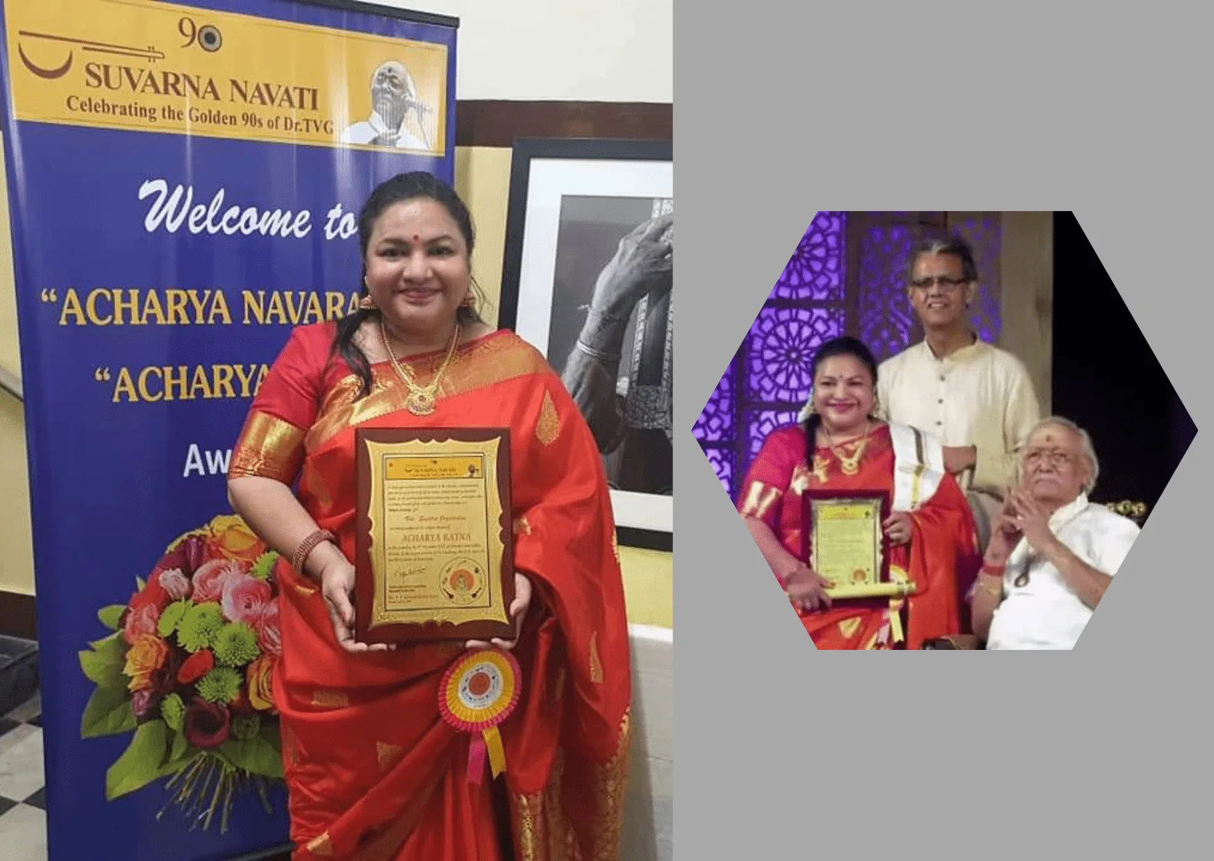 Dr TVG presented Sujietra with the “Acharya Ratna Award” last year September in recognition for to those who were long serving people in Carnatic musical field. She travel all the way to India to receive this coveted award from the legend himself.
