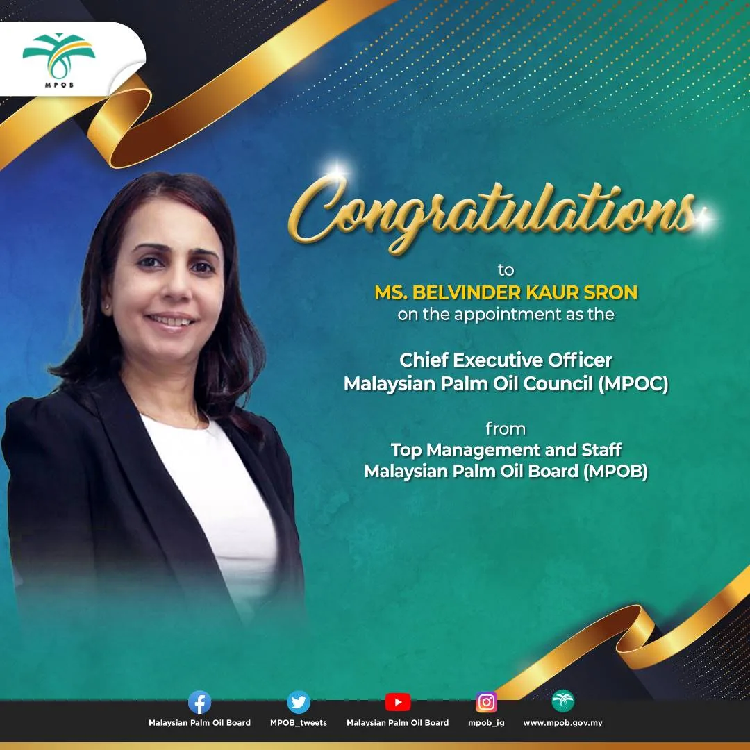 Belvinder Kaur Sron has been elected as the new chief executive officer of the Malaysian Palm Oil Council (MPOC), effective from 15 February 2022.