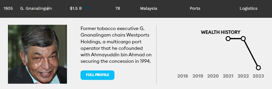 Tan Sri Datuk G Gnanalingam holds the rank with a net worth of USD1.5 billion. Pioneering in logistics industry, the executive chairman of Westports Holdings Bhd , G. Gnanalingam is also known as the country’s first homegrown marketing guru for steering his company to become Asia’s leading cargo and freight player. Co-founded with Ahmayuddin bin Ahmad on securing the concession in 1994, the group owns a 60-year concession to operate and expand its container terminals in Pulau Indah and Port Klang, which will end in 2054. Westports is one of three main port operators in the Strait of Malacca. His son, Ruben Emir Gnanalingam, is Westports’ group managing director. He is also known as the country’s first homegrown marketing guru for steering his company to become Asia’s leading cargo and freight player.