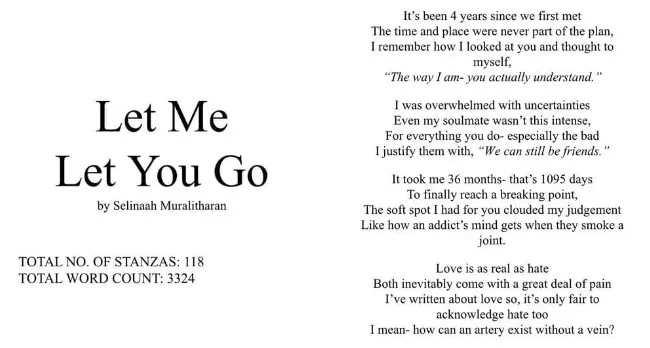 On March 29, one of our young poetess, Selinaah Muralitharan yet again stamped her name in the Malaysia Book of Records for the second consecutive time. She successfully garnered the record for penning the “Longest Melancholic Poem Composed (English)” consisting of 3,324 words and 118 stanzas in the poem titled, Let Me Let You Go.