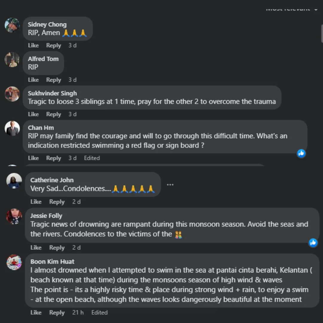 A recent trip by an Indian family to Port Dickson ended in tragedy when three sisters (Kalaivani-30, Dawige-29, and Sathiyadevi-19) who had been swimming at the Pantai Cahaya beach drowned. Meanwhile, R. Veeran (26), and J. Sathiswaran (29), were among the two others who were saved by members of the public and firefighters, and they were taken to a hospital for treatment.