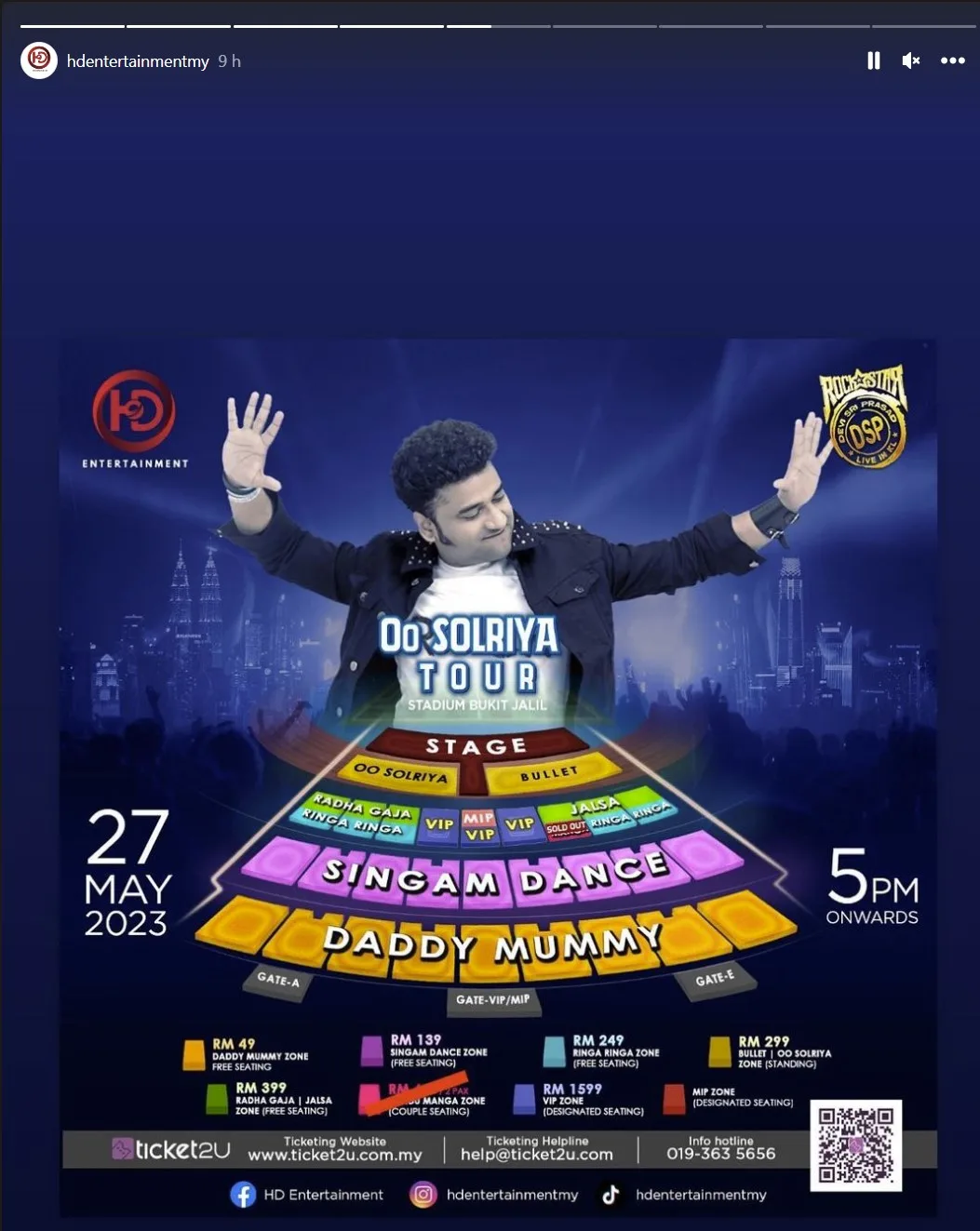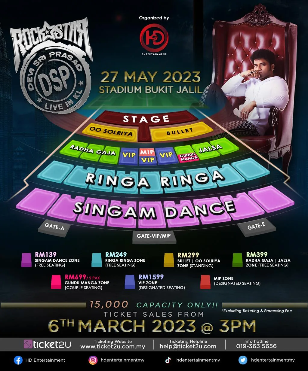 UPDATE : Organizers HD Entertainment have provided an update to the seating arrangement. The Ringa Ringa zone which is priced at RM249 has been upgraded and moved directly behind the Radha Gaja/Jalsa Zone (RM399). Those who purchased the Singam Dance (RM139) tickets have now been upgraded to the previous Ringa Ringa zone, while the original Singam Dance zone is now the newly released Daddy Mummy (RM49) zone.