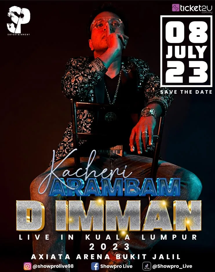 The Kumki-famed music composer’s “D Imman’s Live in KL Kacheri Arambam Tour” is happening on July 8, 2023, at the Mega Star Arena, Sg Wang Plaza Kuala Lumpur.