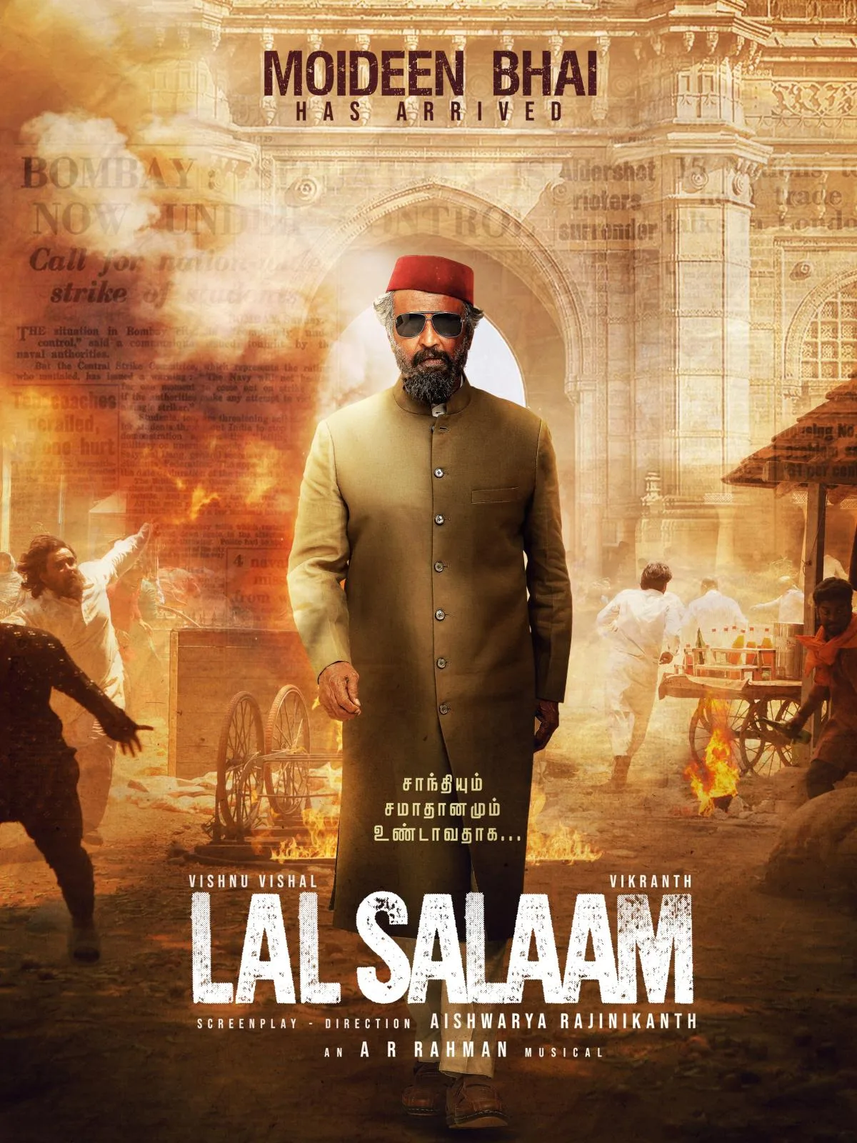 On 8th of May, the director and Lyca Productions presented the character poster of Rajinikanth for Lal Salaam. It is reported that Rajinikanth will appear in the movie in a cameo as Moideen Bhai. Rajinikanth is portrayed in a fashionable outfit and sunglasses on the first-look poster. He was wearing red kufi cap, and knee long coat called Jubah. The poster received a massive celebration by his admirers. Rajinikanth had played a Muslim character after the movie ‘Baasha’ which had Muslim connection as well.