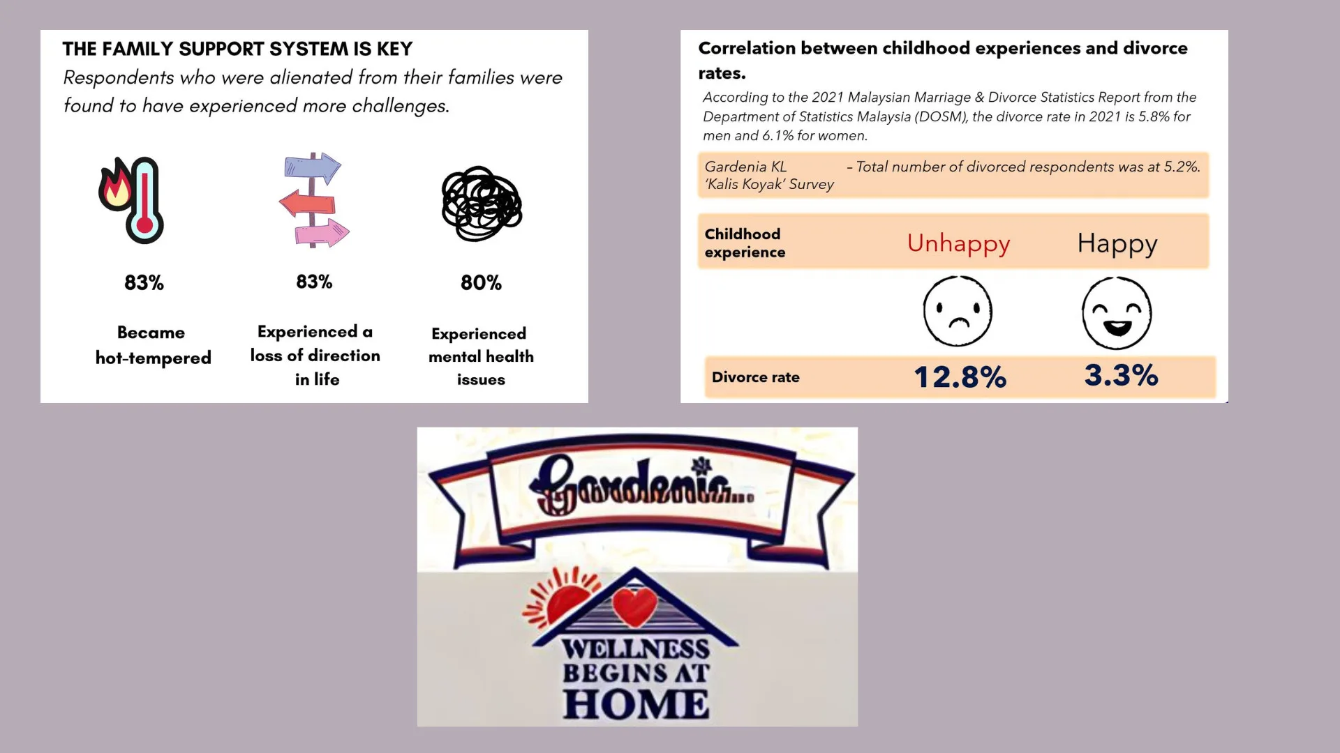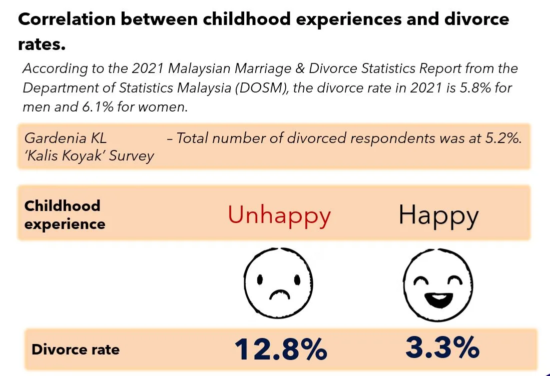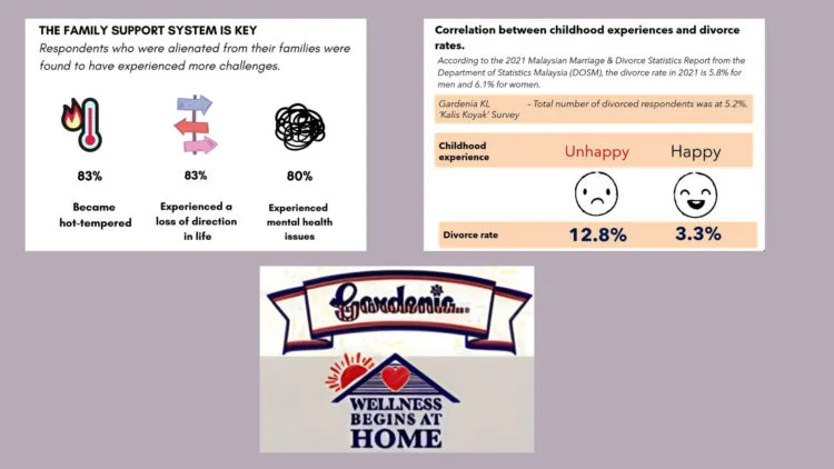 A recent survey by Gardenia Bakeries KL (Gardenia KL) revealed that 15.8% of Malaysians experienced an unhappy childhood. It further revealed a correlation between respondents who suffered unhappy childhoods and the likelihood of divorce in adulthood (12.8%), compared to a divorce rate of 3.3% among respondents who had a relatively happy childhood. The survey kicked off Gardenia KL’s Wellness Begins at Home 2023 campaign, aimed at encouraging people to move from feeling challenged to that of a challenger mentality instead. The survey also examined root challenges and their correlation to mental health issues faced by Malaysians.