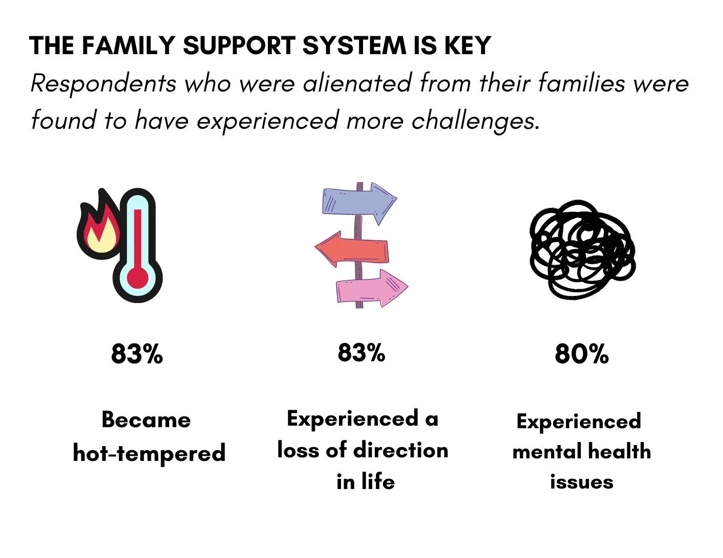 The survey findings affirmed the critical role of the family unit as the foundation of an individual’s sense of identity and a benchmark for choices and tendencies in adulthood. It also revealed that respondents who experienced alienation or estrangement from the family were more likely to experience challenges. Some of the top observations that respondents shared were that 83% felt they became hot-tempered, 80% felt they experienced mental health issues, and 83% experienced a loss of direction in life.