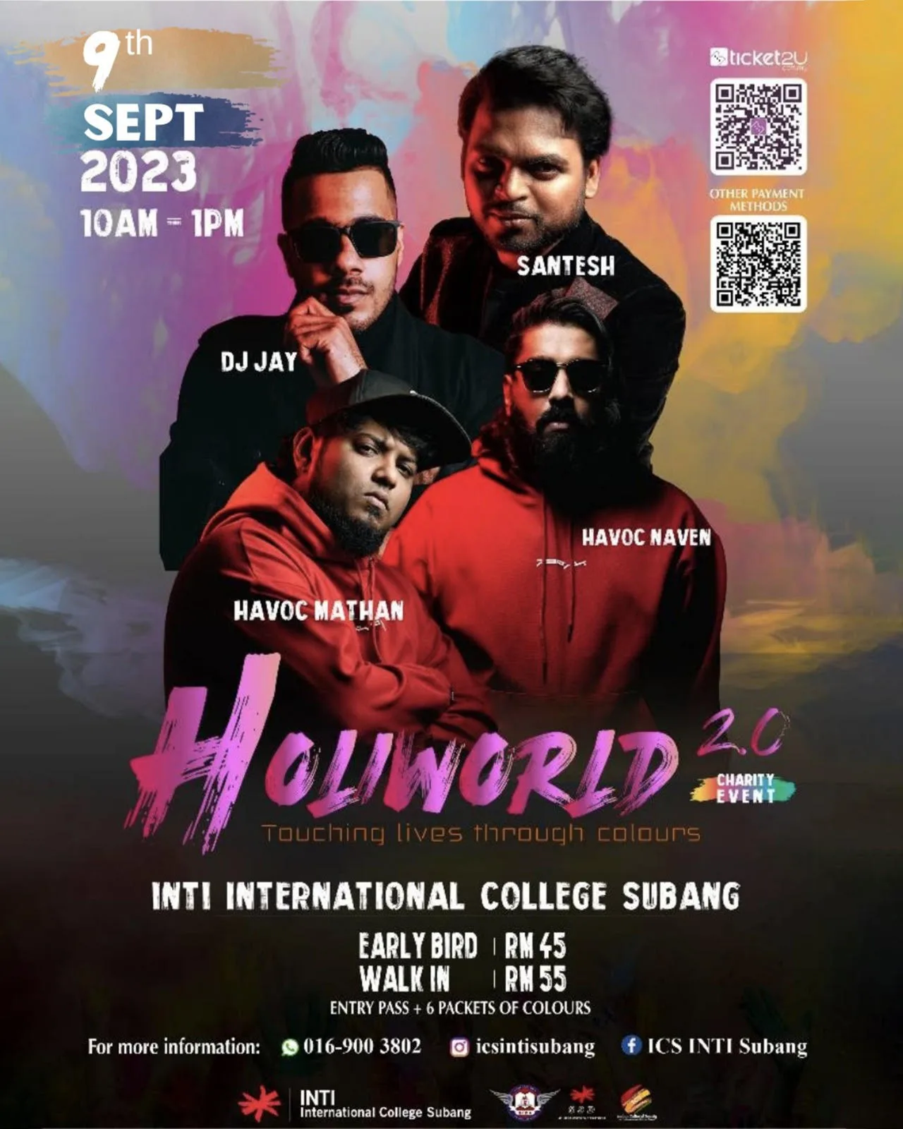 Holiworld 2.0 will be happening on September 9th, 2023, at the INTI International College in Subang from 10:00 a.m. to 1:00 p.m. The event will feature internationally acclaimed and incredibly talented artists such as Havoc Mathan, Havoc Naven, DJ Jay, and Santesh. These four artists have established themselves as astounding artists who have made a unique name for themselves in the music industry as well as contributing immensely to the growth of Malaysian Tamil music and entertainment.