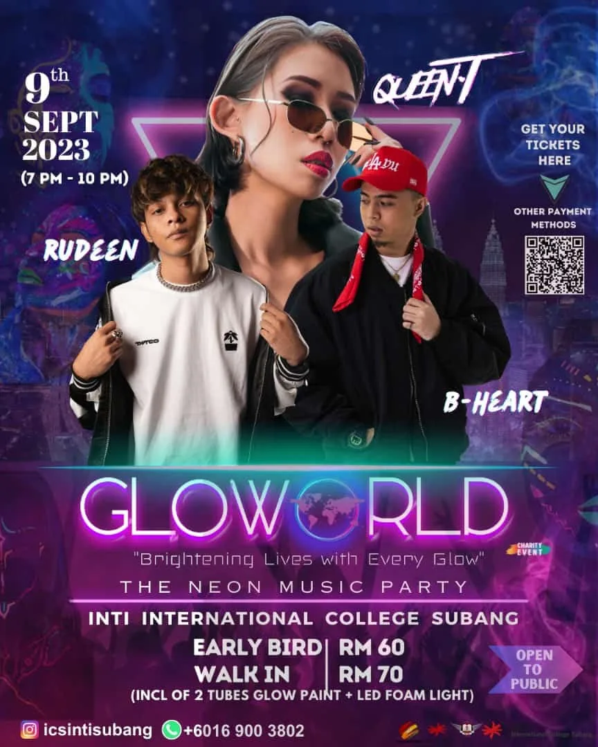 Gloworld will be happening on September 9th, 2023, at the INTI International College in Subang from 7:00 p.m. to 10:00 p.m. This event will feature artists such as Queen T, B-Heart, and Rudeen, who are some of the most unique and creative voices in the Malaysian music industry. Their individual voices and musical talents have added a contemporary dimension to the local music scene.