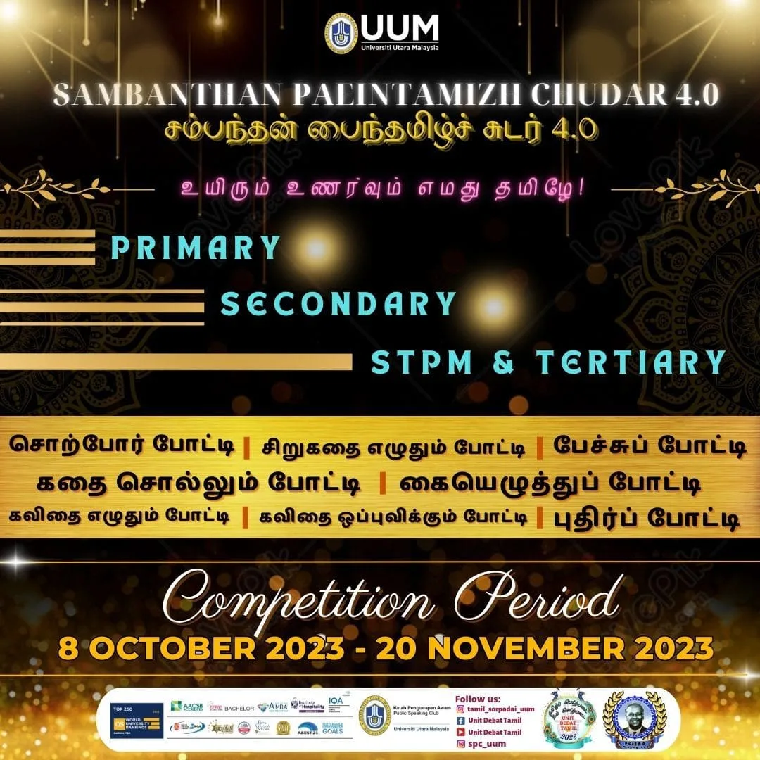 Image Source UUM.edu.myThe previously organised Sambanthan Paeintamizh Chudar 1.0 began only as a single debating competition, and its phenomenal and encouraging turnout of eager participants led the team to coordinate more future projects. But due to the pandemic, the following Sambanthan Paeintamizh Chudar 2.0 and 3.0 were held online, and both events received a resounding amount of support from ardent young minds devoted to the development of the Tamil language. As the organising committee has experience coordinating both physical and virtual events, Sambanthan Paeintamizh Chudar 4.0 will be conducted in a hybrid manner, where most of the competitions will be predominantly held online while the important debate challenges will be conducted physically.