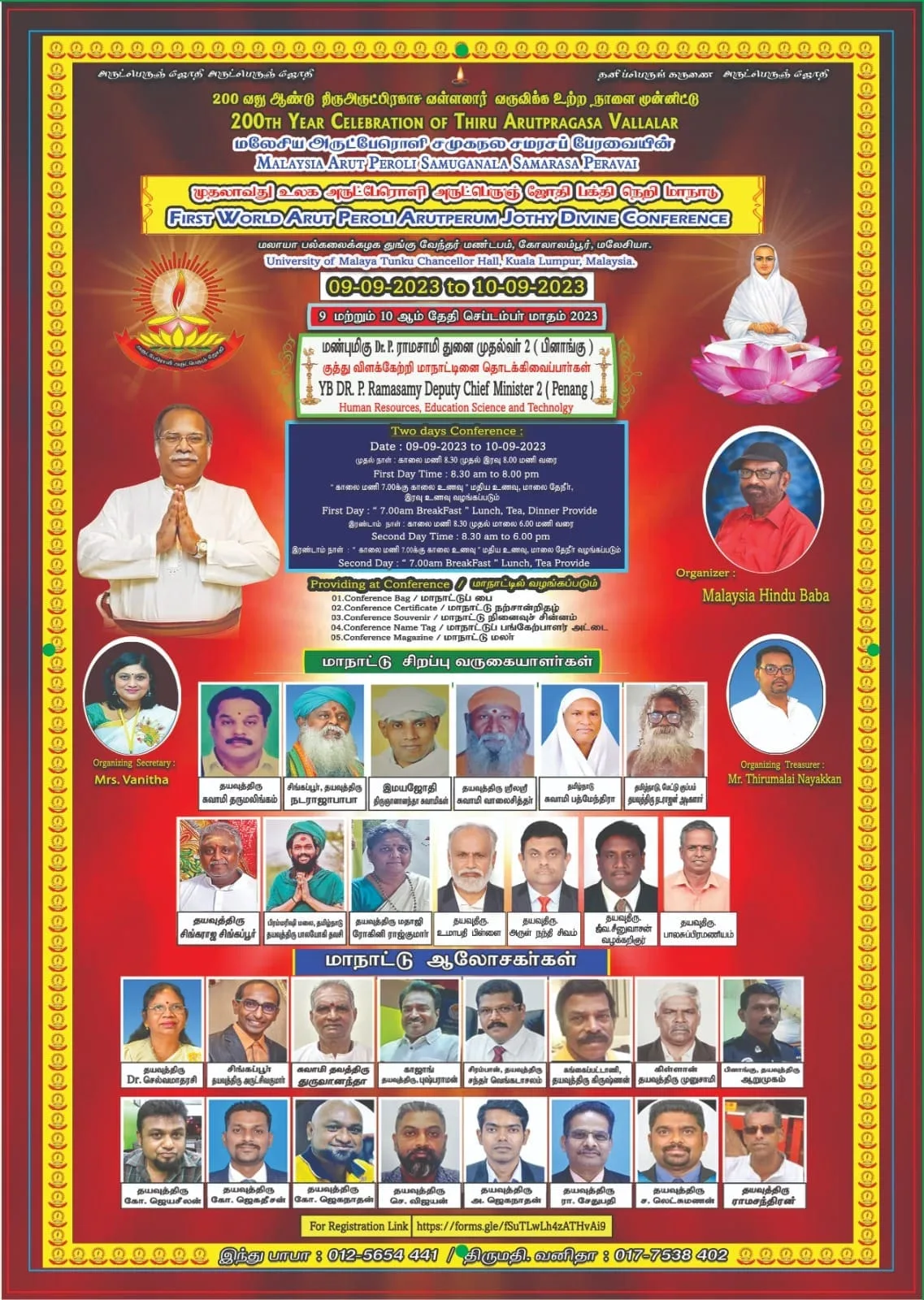 Vallalar has historically been an influential and intriguing ideological and spiritual figure in Tamil society; his thoughts on compassion, morality, and the sanctity of life have always been rooted in ideal aspirations of selflessness. To commemorate the 200th birth anniversary of Vallalar, the First World Arut Peroli Arutperum Jothy Divine Conference was organised by Malaysia’s Arut Peroli Arutperum Jothi Sabai.