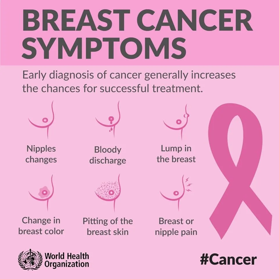 Breast cancer symptoms can vary; some may experience swelling, skin dimpling, breast or nipple pain, and even bleeding from the nipple. While it is common to check for lumps in the breast as an indicator of cancer, some lumps are sometimes too small to feel, and large lumps are sometimes harmless.