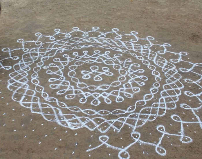 It is a sign that invites everyone into the house, not the least of which is Lakshmi, the goddess of prosperity and wealth. Patterns range from geometric and mathematical designs around a matrix of dots to free-form artwork and closed shapes. Evolving folklore required completing the lines to symbolically prevent evil spirits from penetrating inside the shapes. So they cannot enter the house.