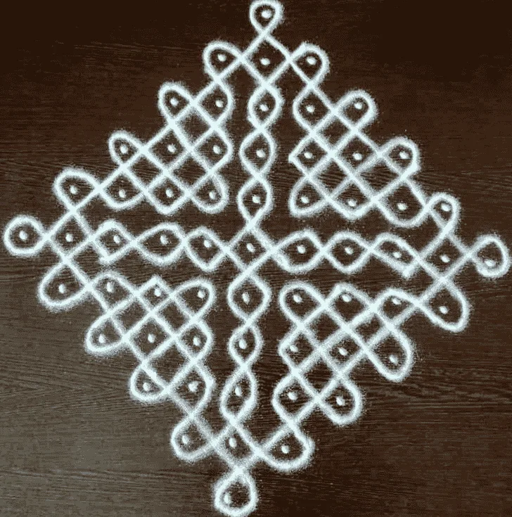This Kolam pattern is is drawn using dot grid only. Most of the time, these patterns ends up becoming a complex pattern.