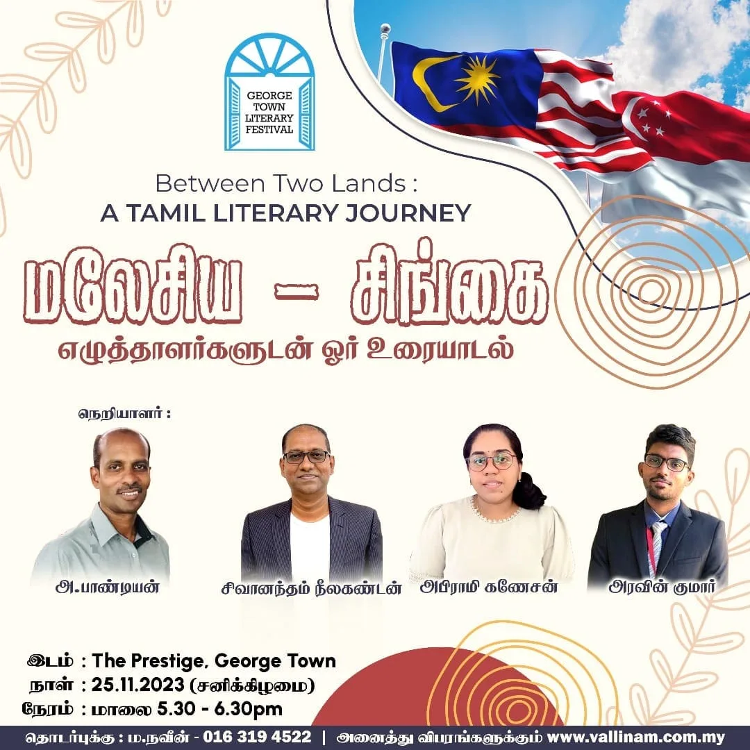 The Tamil portion of the literary festival is jointly organised by Vallinam and GTLF. M. Navin, the festival curator and founder of the alternative and subversive literary magazine Vallinam, has organised two interesting Tamil literary programmes for this festival. The first programme will be centred on Tamil writers from Malaysia and Singapore, while the second will be led by and hosted by A. Pandian. It will feature Singaporean writer Sivananthan Neelakandan and Malaysian writers Abhirami Ganesan and Aravin Kumar.