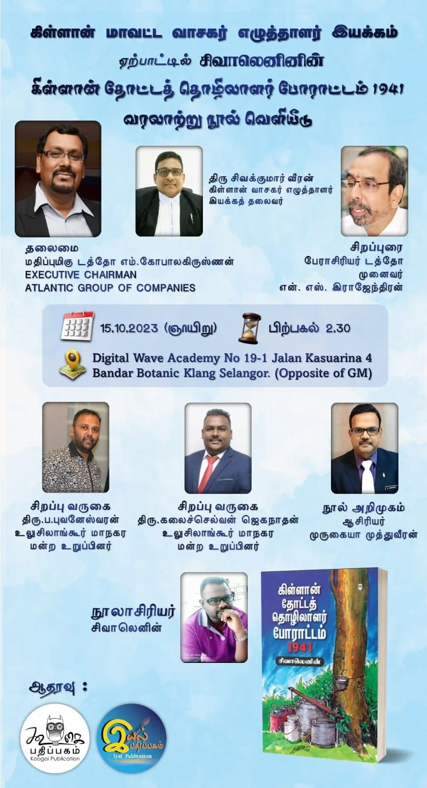 The Klang Districts Readers and Writers Association, with the support of Koogai Publication and Iyal Publication, has proudly organised the book launch event of Siva Lenin‘s 1941 Klang’s Estate Workers Strike, which chronicles the history of one of the most well-organised labour agitations that colonial Malaya has ever seen. The event will take place on October 15, 2023, at 2:30 p.m. in the Digital Wave Academy, No. 19, 1, Jln Kasuarina 4, Bandar Botanik, 41200 Klang, Selangor. This important book launch will also be attended by Dato’ M. Gopalakrishnan, Sivakumar Veeran, the leader of the Klang Districts Readers and Writers Association, and Professor Dato’ N. S. Rajendran.