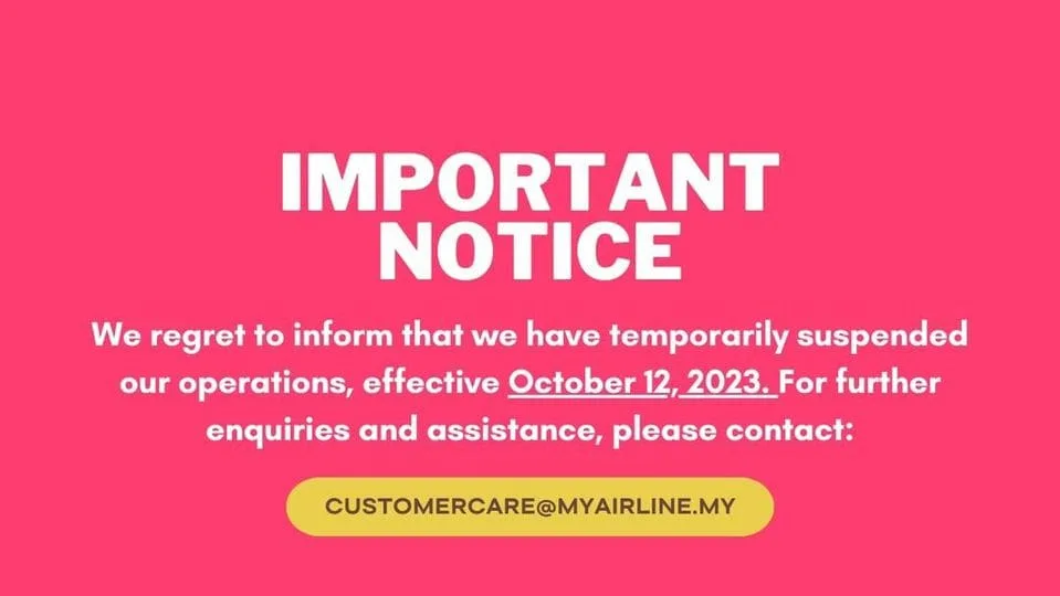 As of October 12, 2023, MYAirline has announced its suspension of services until further notice. This difficult decision has been taken by the company due to the financial burden of the airline services pending shareholder restructuring and recapitalization of the airline.