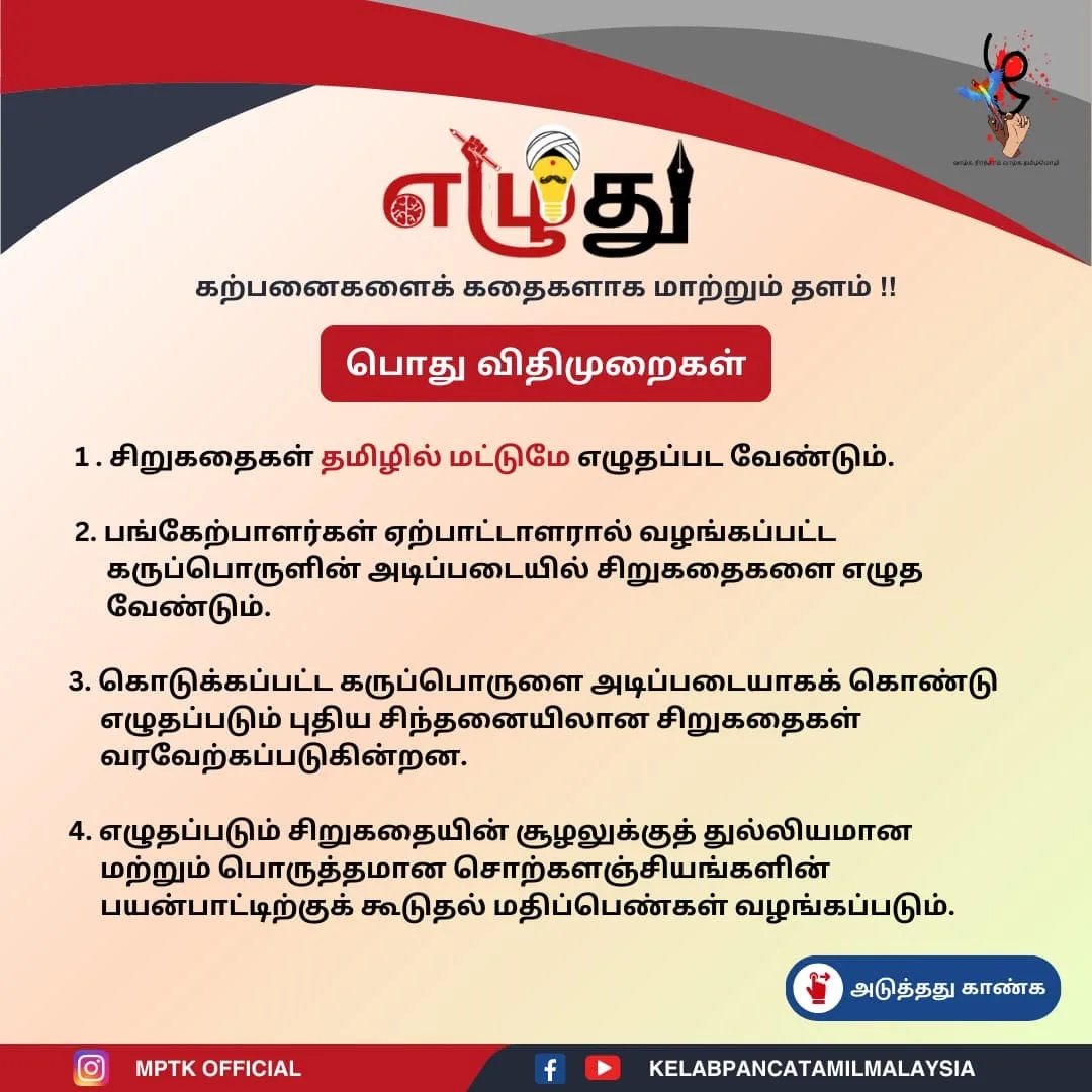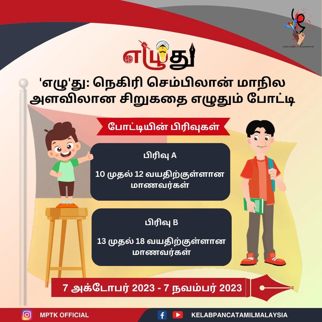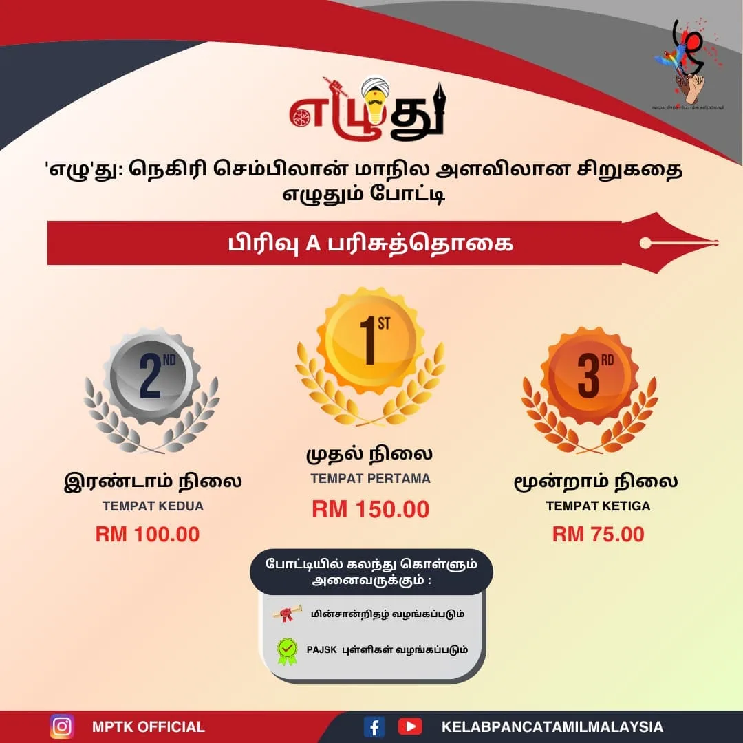 Malaysia Paintamil Kazhagam is an NGO that has been operating since 2021. The organisation has been established on the firm principle of preserving and strengthening the Tamil language and culture through the creation of several educational and cultural programmes. In another one of their strategies at fostering the Tamil language among the youth of today, the organisation has planned Ezhuthu: A Negeri Sembilan State-Level Tamil Short Story Writing Competition.