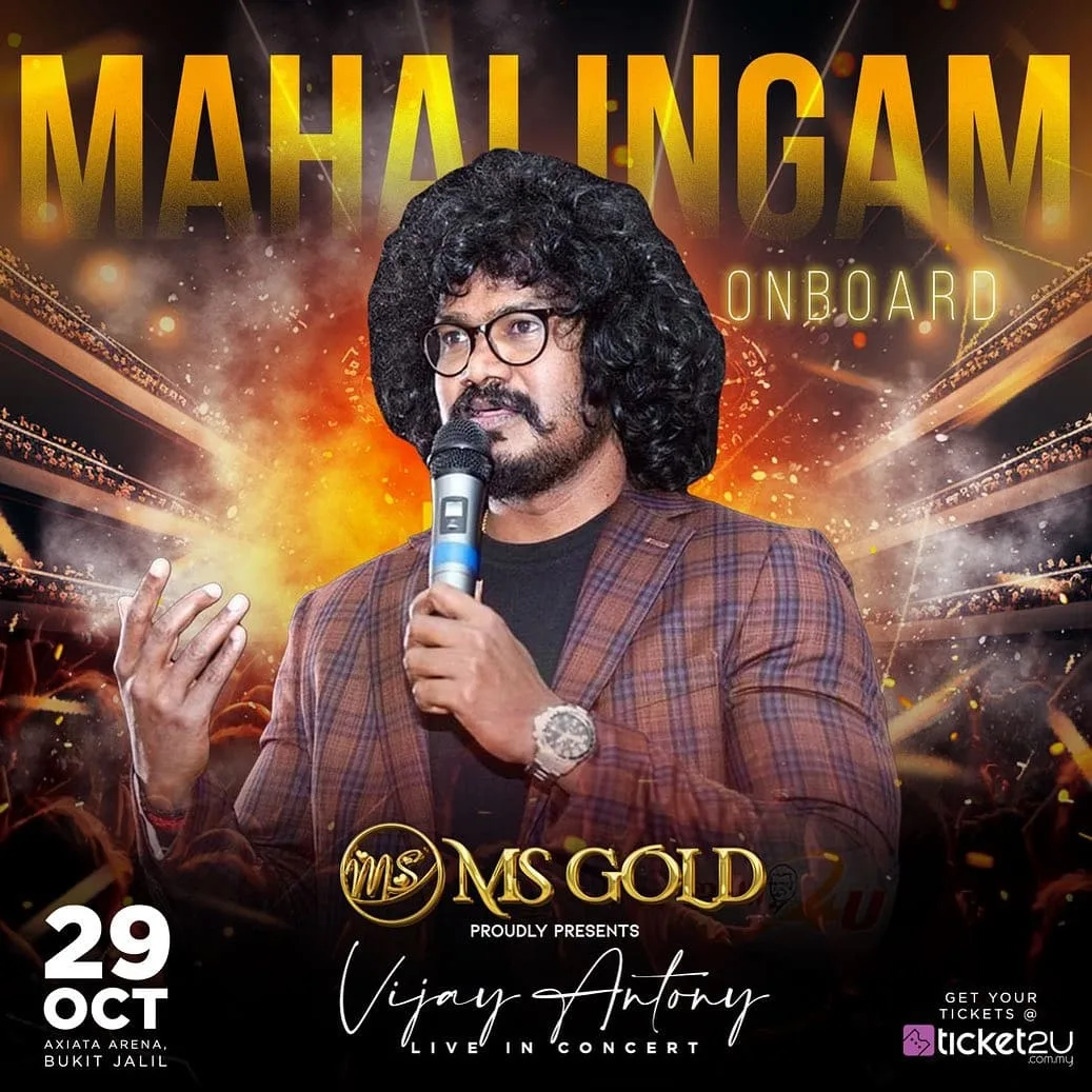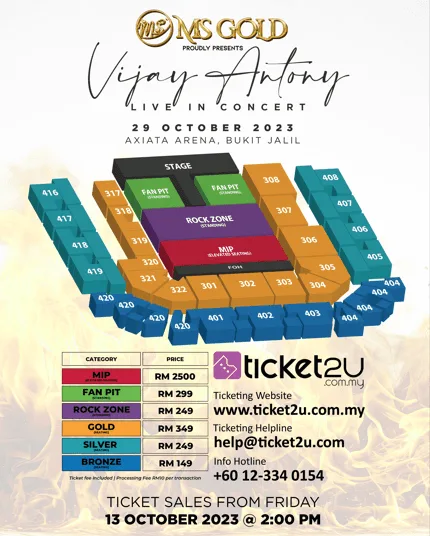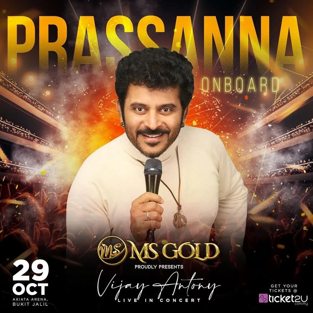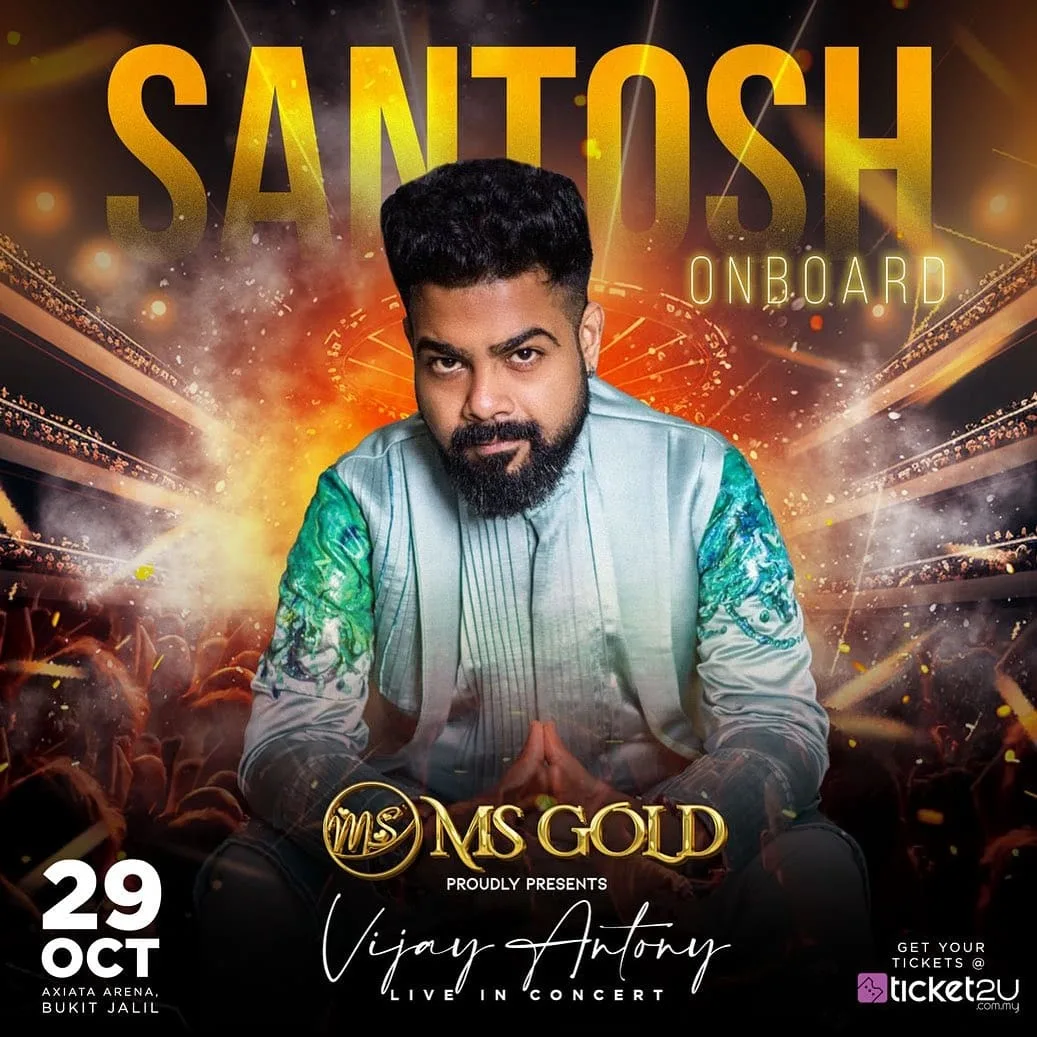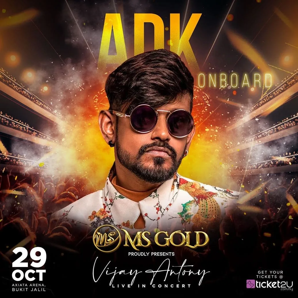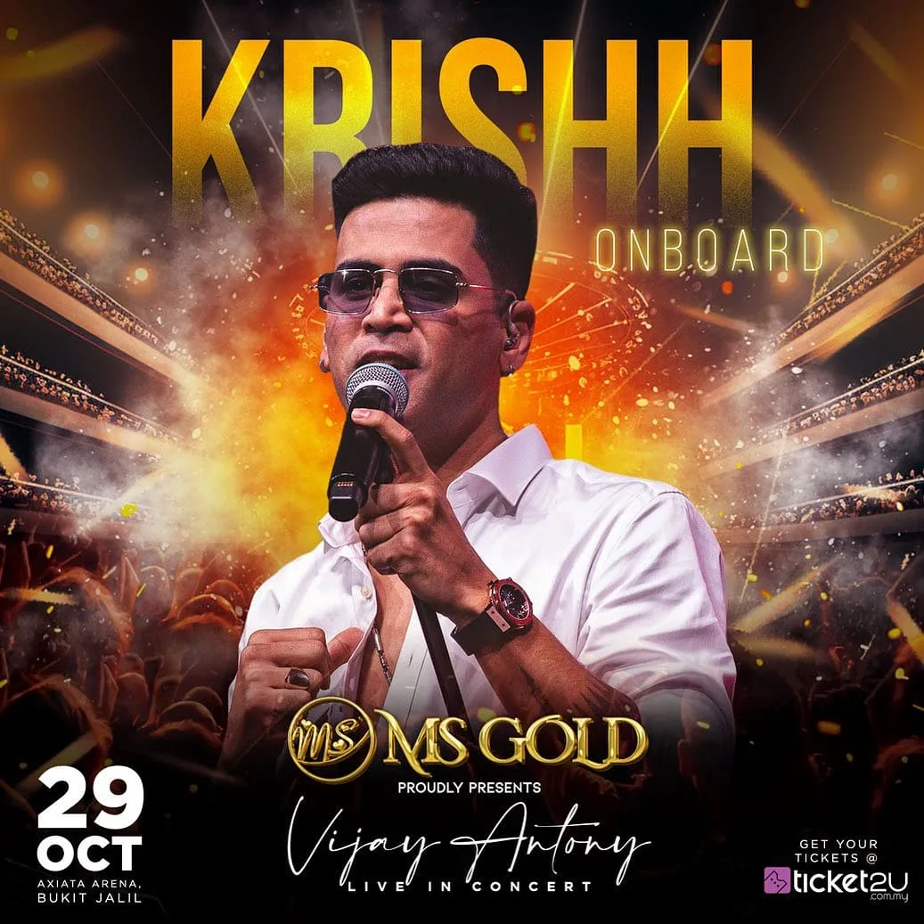 Vijay Antony Live In Concert presented by Malik Streams and MS Gold is happening on 29th October 2023, Sunday at Axiata Arena, Bukit Jalil.