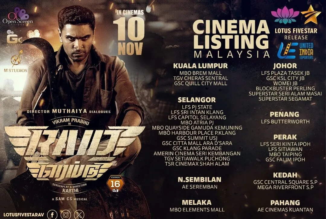 Raid is an action thriller drama film written and directed by promising filmmaker Karthi. The primary actors are Vikram Prabhu and Sri Divya, with Ananthika Soundara Raja, Daniel, Rishi Rithvik, and many more in supporting parts. This film’s soundtrack and background score were created by Sam C. S. The film was produced by S. K. Kanishk and G. Manikannan under the banners of M Studios, Open Screen Pictures and G Pictures.