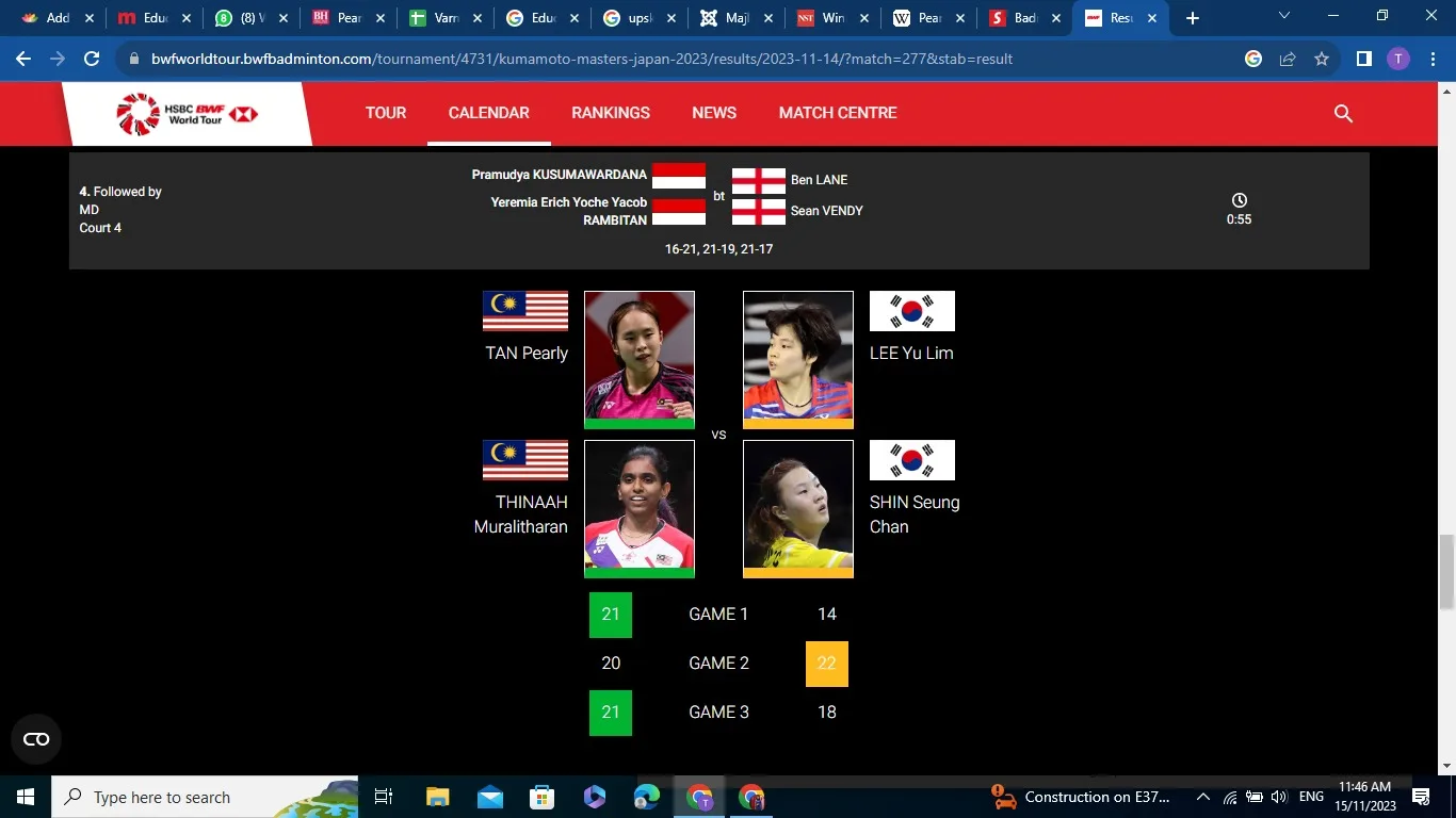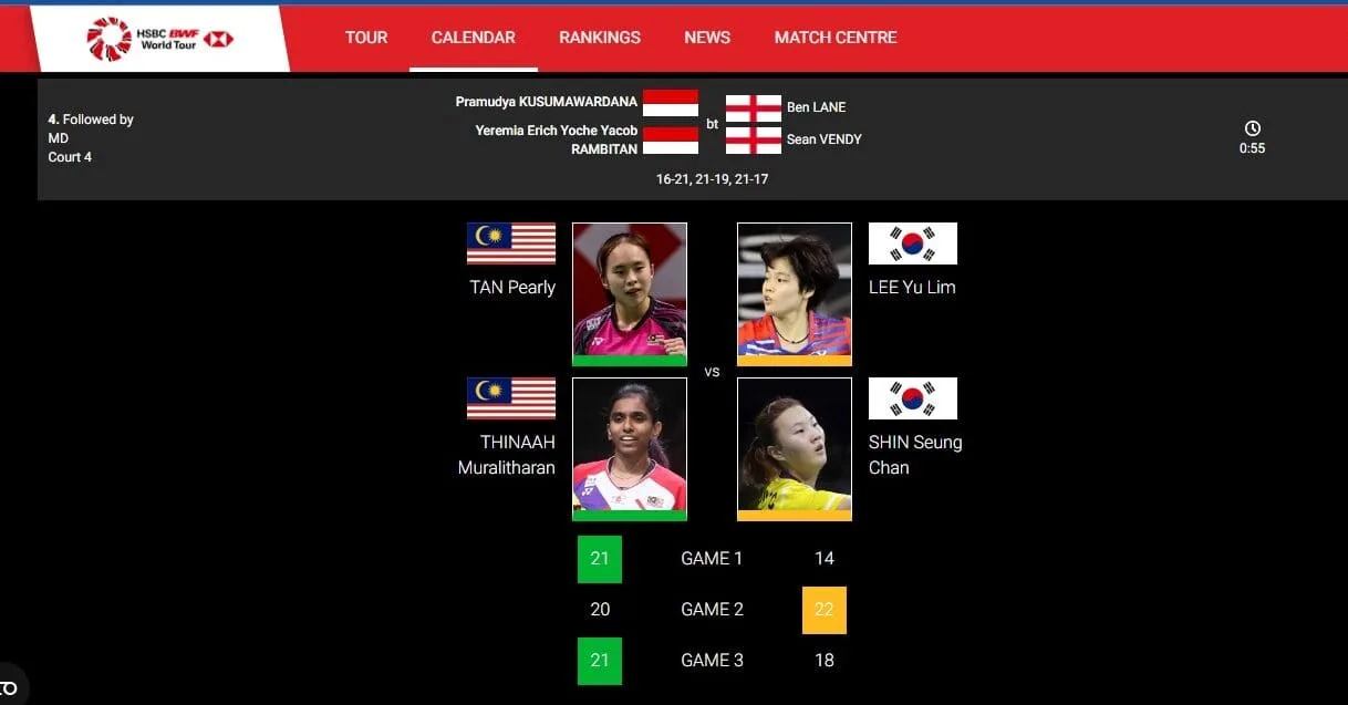 After a significant hiatus caused by Pearly’s back injury, the former French Open champions marked their comeback by winning the South Korean pair, Lee Yu Lim and Shin Seung Chan, in a thrilling first-round encounter at Kumamoto Gymnasium. The match unfolded with a score line of 21-14, 20-22, 21-18, showcasing Pearly Tan and Thinaah Muralitharan’s resilience and skill as they navigated through the challenges and secured victory.