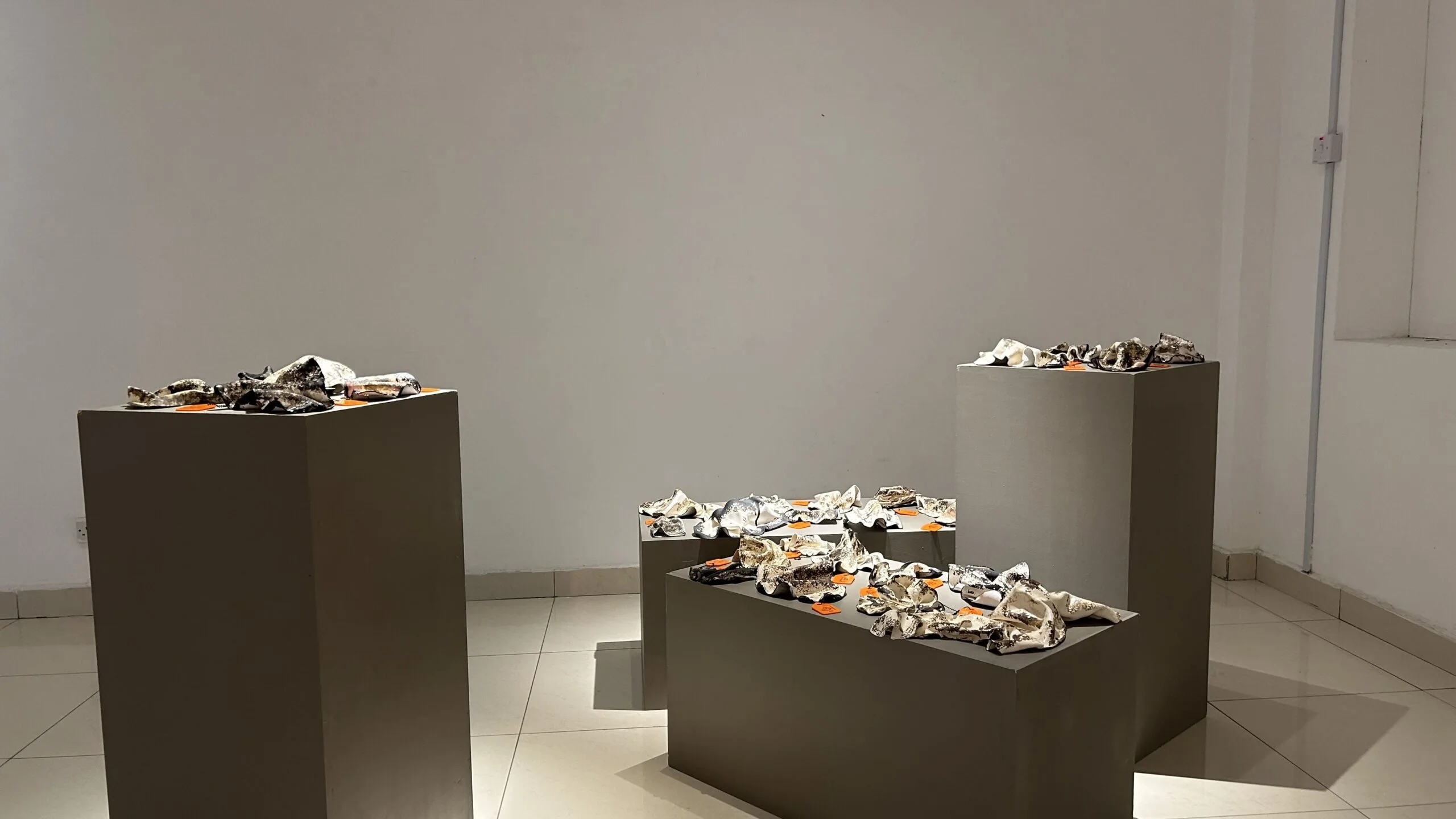 Poojitha’s work is a one that transcends the onlooker into a space of archeological and metaphorical explorations. She has meticulously placed cloth-like ceramic clay that evoke the scenery of excavation sights that have found Tamil inscriptions on ancient cloth materials. The piece is incredibly interactive, whereby it encourages the audience to walk around it and inspect the pieces as if they were an archaeological space themselves. The manner in which the clay was sculptured was also a synthesis between traditional and modern methodology, paralleling how the modern science of archaeological empiricism is imposed upon the past to analyse the history of an ancient people and their language.