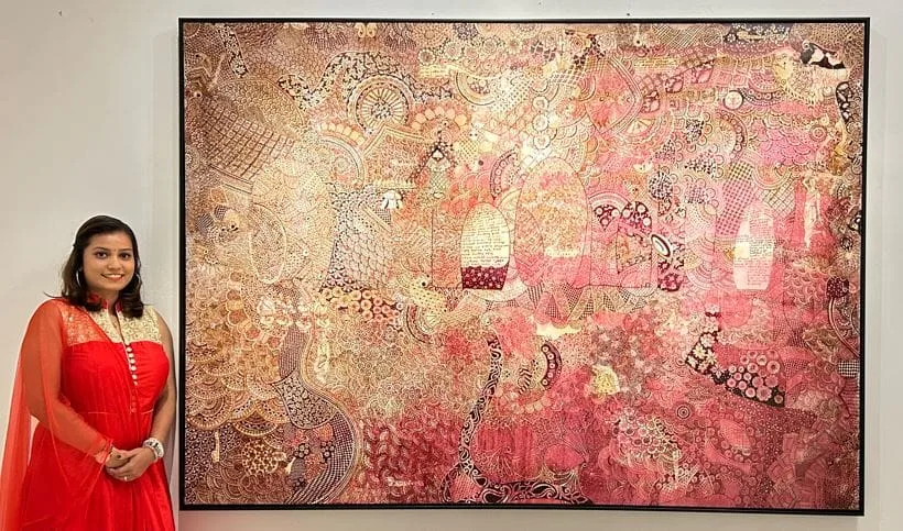 A piece that took the artist nearly 2 years to complete, is another work that express beautifully and intricately the infinite subtilties of Tamil before the canvas, evoking the myriad, entangled, and amalgamated nature of the Tamil language and her people. Influenced by her Periyarist father, Dravidian philosophical thought, and her own devotion towards the language and people, Moly constructs glimpses of Tamil’s epochs in this breathtaking work of hers. Her work is mystical, entrancing, and critical in how it engages with the fabric of Tamil’s deep histories of theology, monarchies, and linguistic metamorphosis. The colours presented in her work exiles one into a corporal space of the rich soiled, earthly abundant, and rooted world of the language and people, while the bleeding of the stained red evokes the pained flesh of Tamils existence, which has bled at the hands of countless cruelties over the course of time.