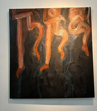 The Nandhi is a popular image that can be spotted in Sanker’s work, and in this art piece in particular, he expresses the mystical and cultural relationship that Tamil Hindu theology has with the Tamil language. The figures, which are depictions of the Tamil letter ‘ந’, seem to be dancing, elated, and entranced. The artist believes that this spiritual and cultural connection lives within all the descendants of the language and that no amount of change can alter the anatomical structure of the Tamil people, who have been deeply influenced by this spiritual and metaphysical world. The stark contradiction between the fiery ignited orange and the abyss like black, which signifies the predominant skin colour of Tamils, acts as a metaphor that the bodied black flesh of Tamils is one that bears the light of mystical rapture.